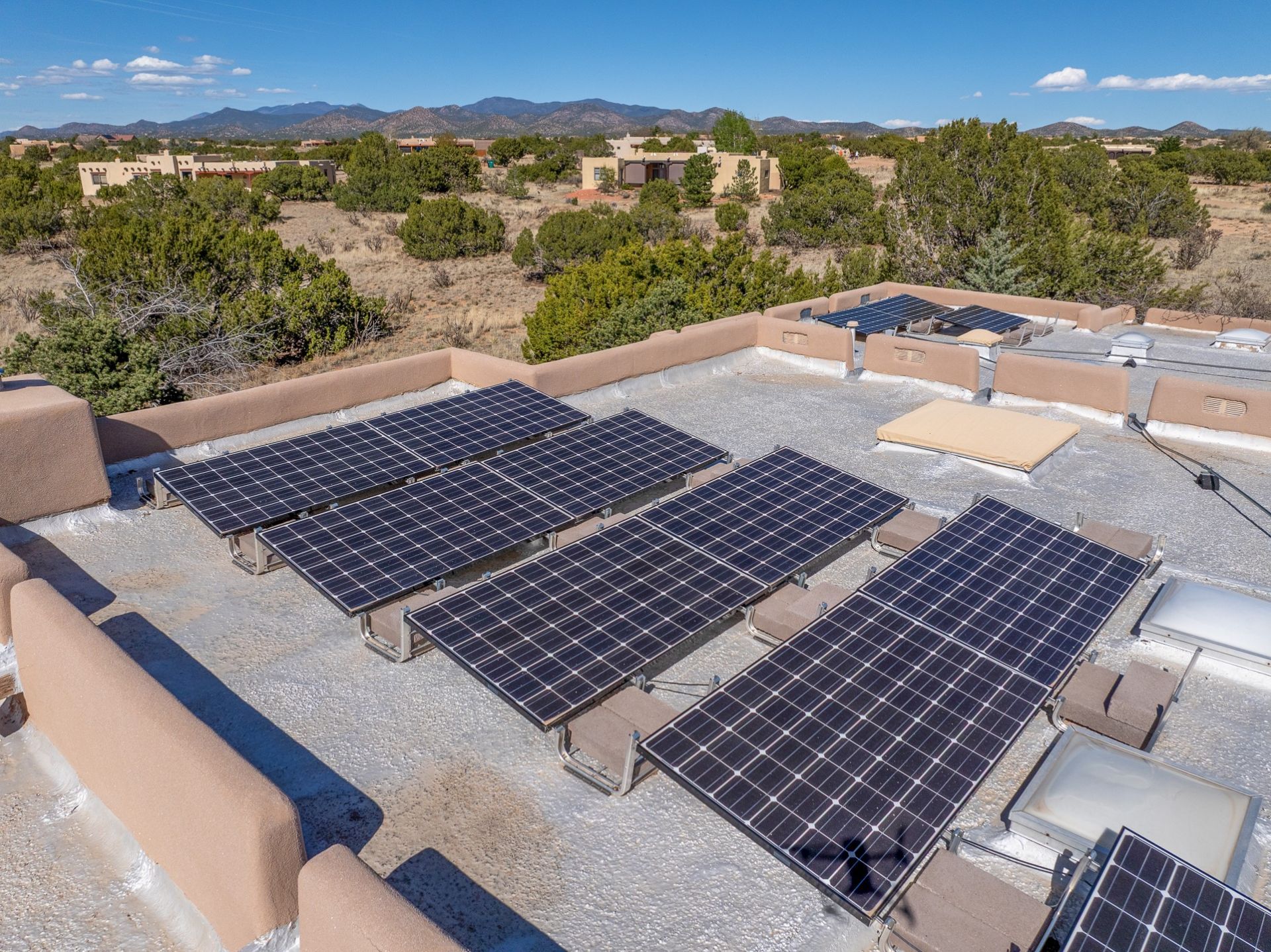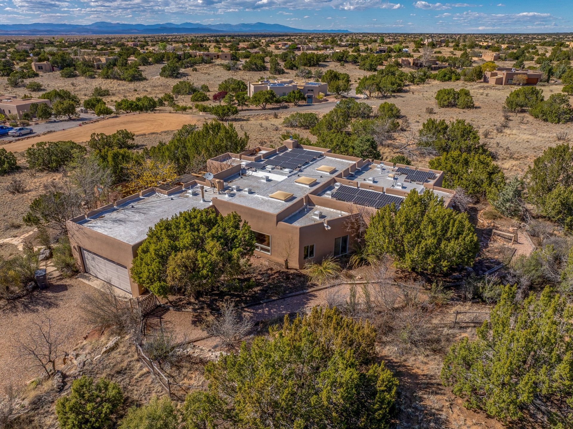 Sited on 1.6 acres in Eldorado, this 2,700 sq. ft. single-level home offers a rare blend of character, privacy, and thoughtful design?available for the first time since it was custom built in 1996. Surrounded by mature landscaping, the property is both welcoming and serene. The main living and dining area features a classic wood burning fireplace, vigas, and direct access to a charming front courtyard with a deep west-facing portal draped in mature wisteria?perfect for outdoor living and sunset evenings. A truly unique feature, the indoor heated lap pool serves as a central architectural element, separating the bedroom wings while enhancing privacy and creating a sense of retreat. The kitchen remains in its original configuration, offering generous space and a central cooking island. This opens to a covered portal within the courtyard. The bedrooms are well positioned for privacy. One guest bedroom opens directly to the enclosed backyard under a covered portal?ideal for a home office. The spacious primary suite also enjoys backyard access, with a covered sitting area that extends the home's connection to its beautifully landscaped surroundings. With solar in place, abundant natural light from the many skylights throughout and a distinctive layout, this Eldorado home offers a rare opportunity on a truly special property with mountain views.