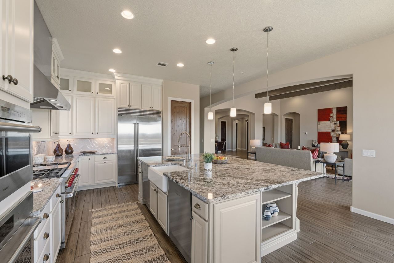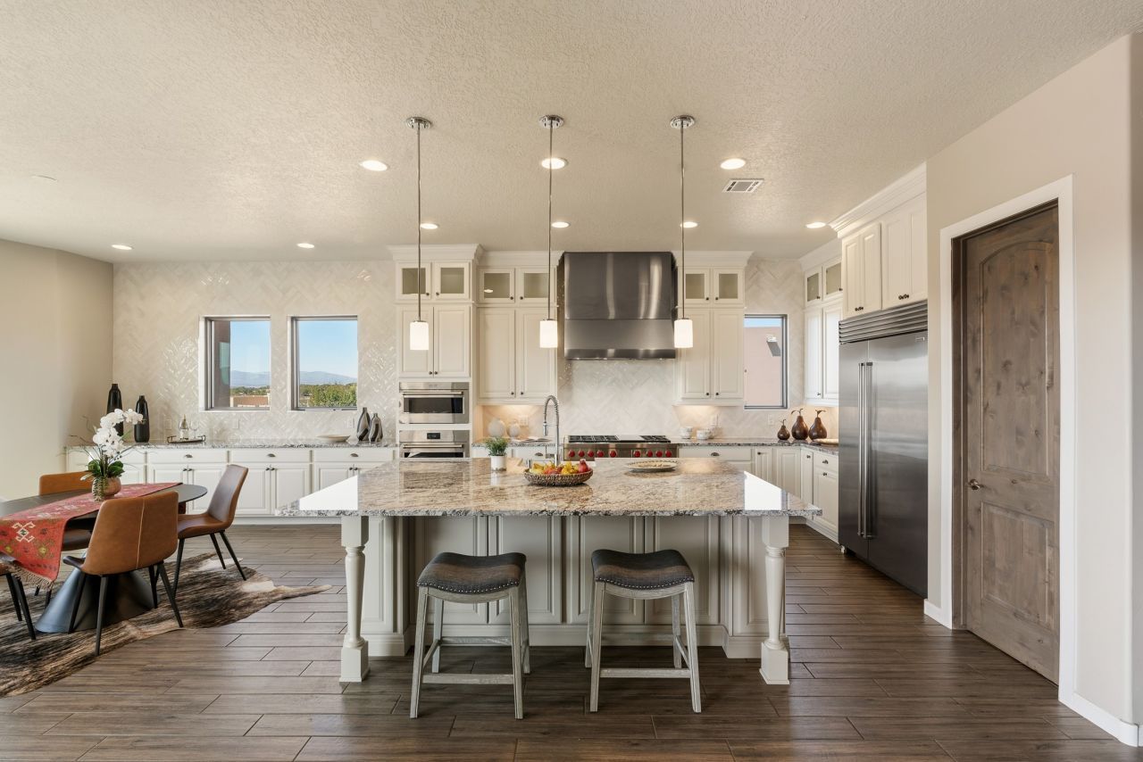Exceptional value on this move in ready Las Campanas Contemporary Pueblo Retreat Where contemporary design meets timeless Santa Fe elegance, this 3,523-square-foot single-level residence offers the perfect balance of sophistication, privacy, and sweeping mountain views. Completed in 2023, this home features upgraded modern finishes and is nicely sited on a corner lot ? backing to open space to the west. Light-filled and beautifully proportioned, the open-concept layout flows effortlessly between the living, dining, and outdoor spaces. The great room features beamed ceilings, a sleek gas fireplace, and panoramic views of the Jemez Mountains?capturing Santa Fe's legendary sunsets in every season. At the heart of the home, the chef's kitchen is both striking and functional, equipped with upgraded Wolf, Sub-Zero, and Asko appliances - including a six-burner double oven range, built-in convection oven and microwave, and dual dishwashers. Granite countertops, crisp white cabinetry, and a generous island create a gathering space as stylish as it is practical. The primary suite is a private sanctuary with breathtaking mountain views and a spa-like bath featuring dual vanities, a dedicated makeup area, and luxurious finishes. A separate guest suite with its own living area offers comfort and independence for visitors, while a dedicated office adds flexibility for work or creative pursuits. Outdoors, beautifully landscaped patios extend the living space?perfect for dining al fresco, entertaining, or simply enjoying the quiet beauty of the high desert. An oversized two-car garage offers abundant space for vehicles and storage. Located just minutes from The Club at Las Campanas, where fine dining, golf, fitness, and spa amenities await (membership optional), this residence embodies modern Santa Fe luxury?panoramic views, refined design, and tranquil living in one of the city's most prestigious communities.