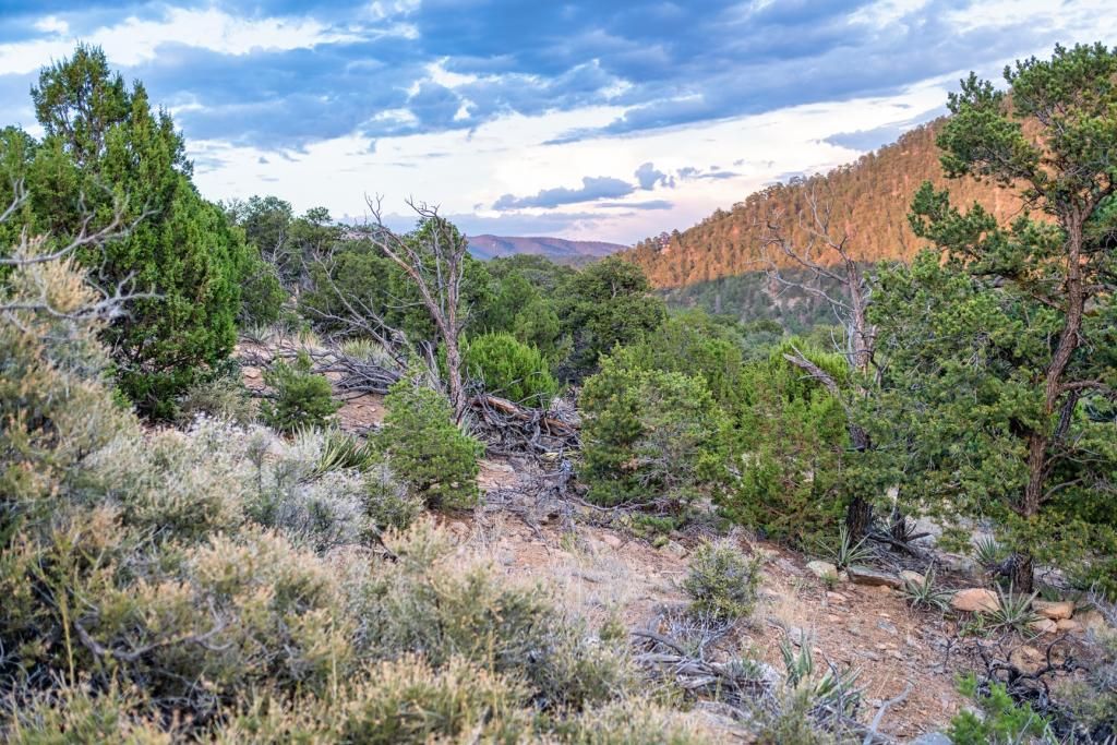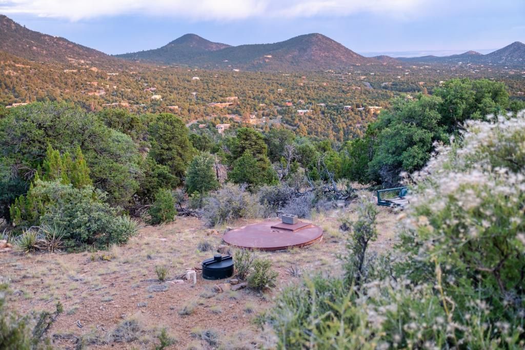 So close, but up above it all. Stunning mountain-side panoramas from this elevated 5 acre lot in the Sangre de Cristo foothills, just 15 minutes from the Plaza. Shared well and electric transformer on the property, roughed in driveway on and through the lot. Hundred-mile views and world-class sunsets, some views into La Barbaria canyon, well treed. Lot is sloped, but has substantial areas where the slope is gentle enough to build.