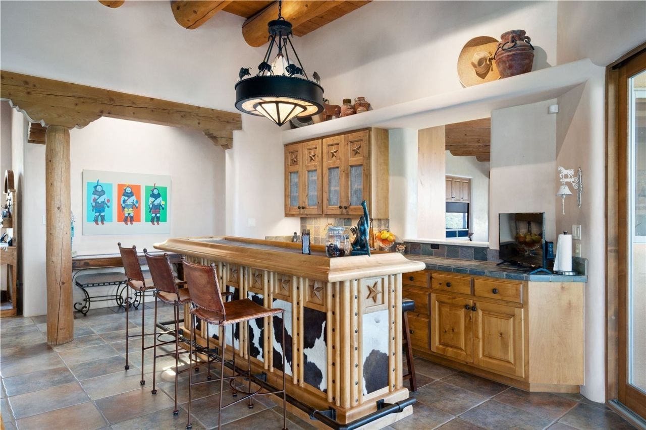 Set high on a private hilltop, and enjoying sunset mountain views, this custom Pueblo Revival compound embodies craftsmanship, substance, and timeless Santa Fe style. Built with quality at every turn and refreshed with a new roof and stucco, the property is introduced by a grand, gated courtyard with center fountain, full poured concrete drive, and a spacious garage for 4 cars. The 3-bedroom main residence, remodeled by Kim Dressel in 2012, reveals artisan details from the moment you step into the dramatic Zaguan entry. Finishes include slate floors, carved woodwork by master craftsman David Naylor, thick plaster walls, and a freestanding bar that anchors the open living and dining spaces. The chef's island kitchen features Wolf, Sub-Zero, and wine refrigeration, ideal for both daily living and entertaining. The split-bedroom layout offers privacy, while the primary suite is a sanctuary with dual closets, built-ins with fridge, kiva fireplace, and a dedicated exercise room. Outdoor living extends to multiple portals, a rooftop deck with 360° mountain views, a full kitchen, fireplace, and an elegant in-ground 8' x 12' cocktail pool. The 3,050 sq. ft. second residence, newly built by Kim Dressel in 2013, echoes the same solid construction and fine finishes. With 2 bedrooms, 2 living rooms, a full kitchen and dining space, carved details by David Naylor, and far-reaching Sangre de Cristo and Jemez views, it offers luxurious comfort. Special features include a built-in bar, 90-inch screen with 9-speaker theater, and an expansive portal with pizza oven, grill, and fireplace. Additional amenities?a workshop, generator, and 15,000 gallon irrigation cistern?enhance function and reliability. Only 15 minutes from The Plaza and Santa Fe Airport, this compound is ideal for multi-generational living or hosting guests in a one-of-a-kind setting where custom design, quality finishes, and Pueblo Revival authenticity define the experience. A contiguous 1.7-acre lot on Black Mesa may be available separately. Membership to the Club at Las Campanas is available for purchase and upon???????????????????????????????? approval.