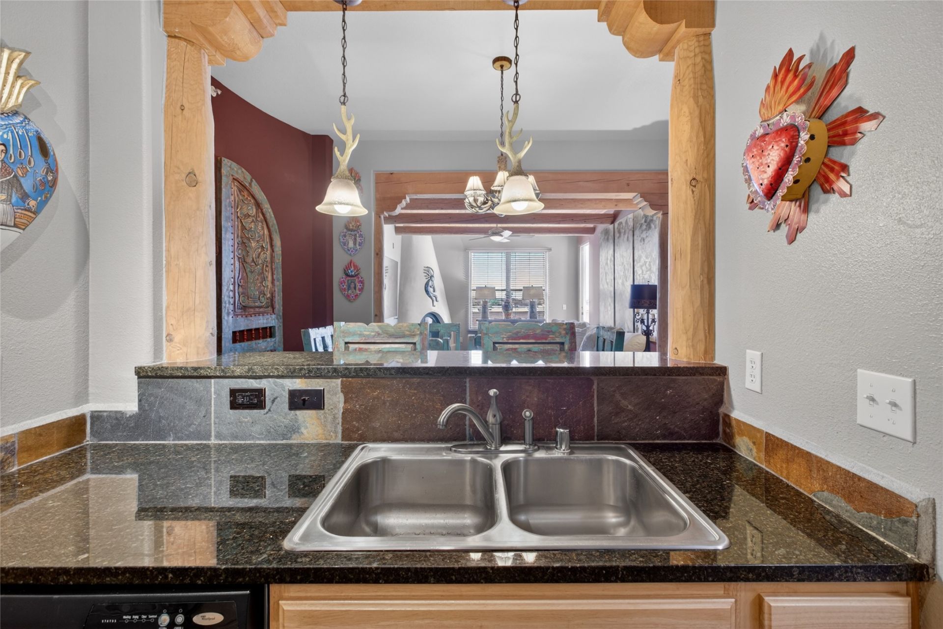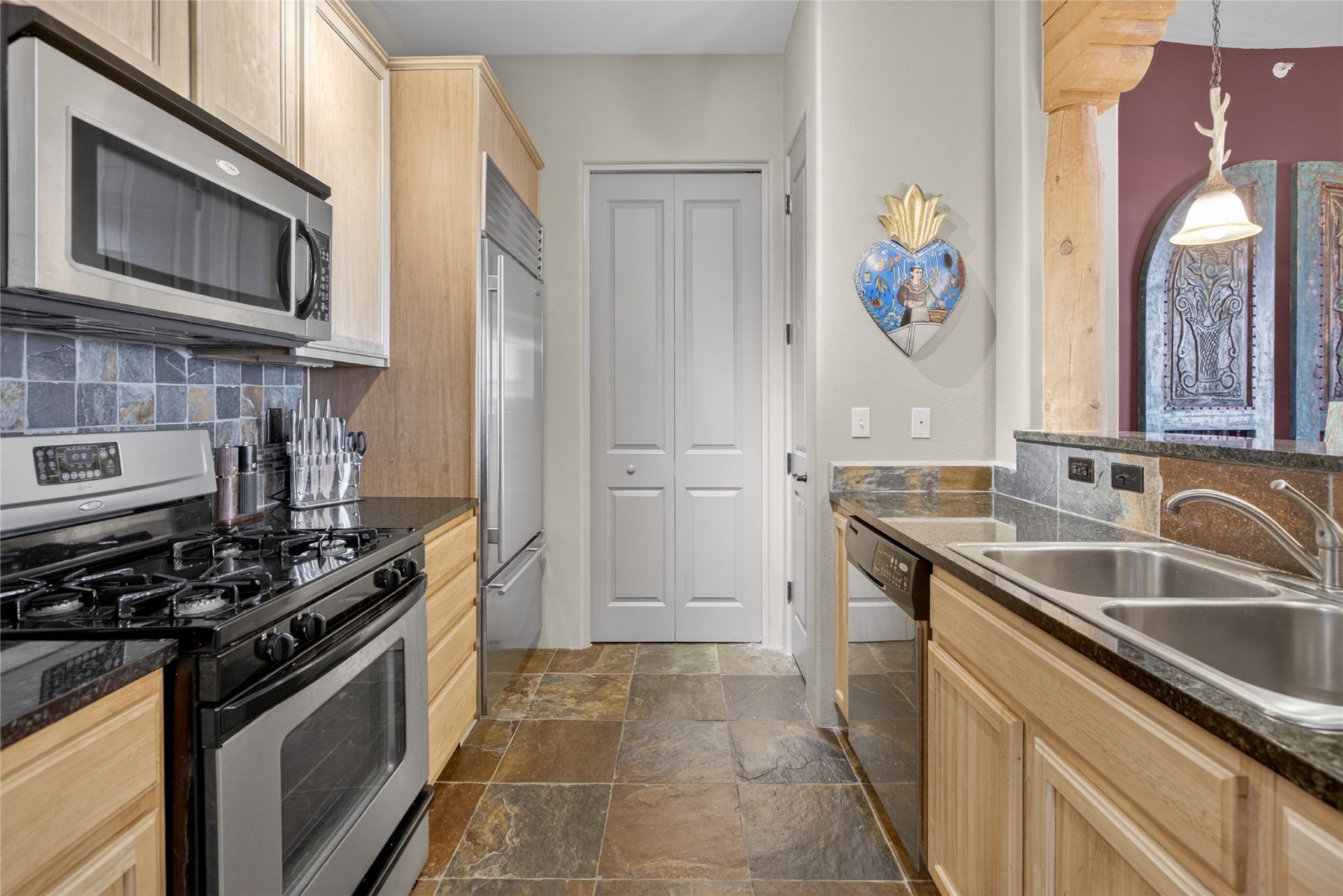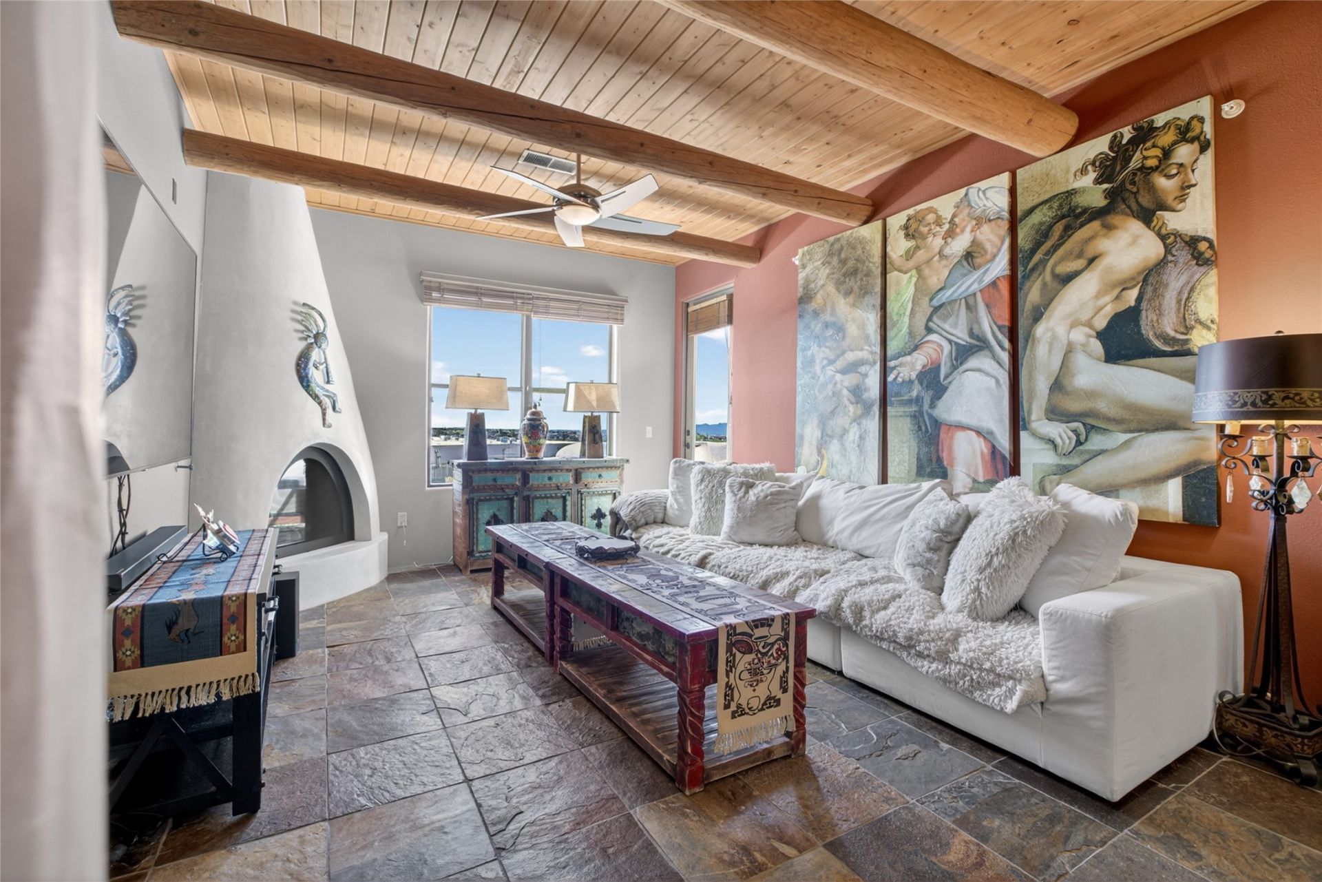 Welcome to a stunning condo that feels straight out of New Mexico Magazine, offering a refined blend of Santa Fe style and effortless living. This 2-bedroom, 2-bath residence was the former model unit and features upgrades not found in every home within the community. Ideally situated on the third-floor corner of Wings C and D, the condo enjoys mountain views from both the patio and the primary bedroom. Upon entry, you're welcomed by abundant natural light and a rare foyer skylight, creating a warm and inviting first impression. The kitchen is both functional and beautiful, featuring stainless steel appliances and a Sub-Zero refrigerator, ideal for both everyday living and entertaining. A custom closet system in the primary suite adds thoughtful organization, while high-end designer lighting fixtures enhance the home's overall ambiance. Additional details include Hunter Douglas blinds, ceiling fans in the living room and both bedrooms, and extra windows in the primary suite?offering enhanced light, privacy, and uninterrupted eastern mountain views. Life at The Alameda's offers a true lock-and-leave lifestyle, designed for ease and enjoyment. The HOA covers many of the responsibilities typically associated with single-family ownership, including common area maintenance and utilities, hazard insurance, and access to exceptional amenities such as a swimming pool, fitness center, conference spaces, library, elevators, clubhouse, secured gated entry, and beautifully maintained grounds. HOA dues also contribute to reserves for major components such as stucco, roofing, and asphalt, all professionally managed by HOAMCO. Conveniently located near shopping, dining, entertainment, and scenic walking and biking trails, this residence offers the perfect balance of comfort, convenience, and classic Santa Fe charm. Furniture available for purchase by separate bill of sale.