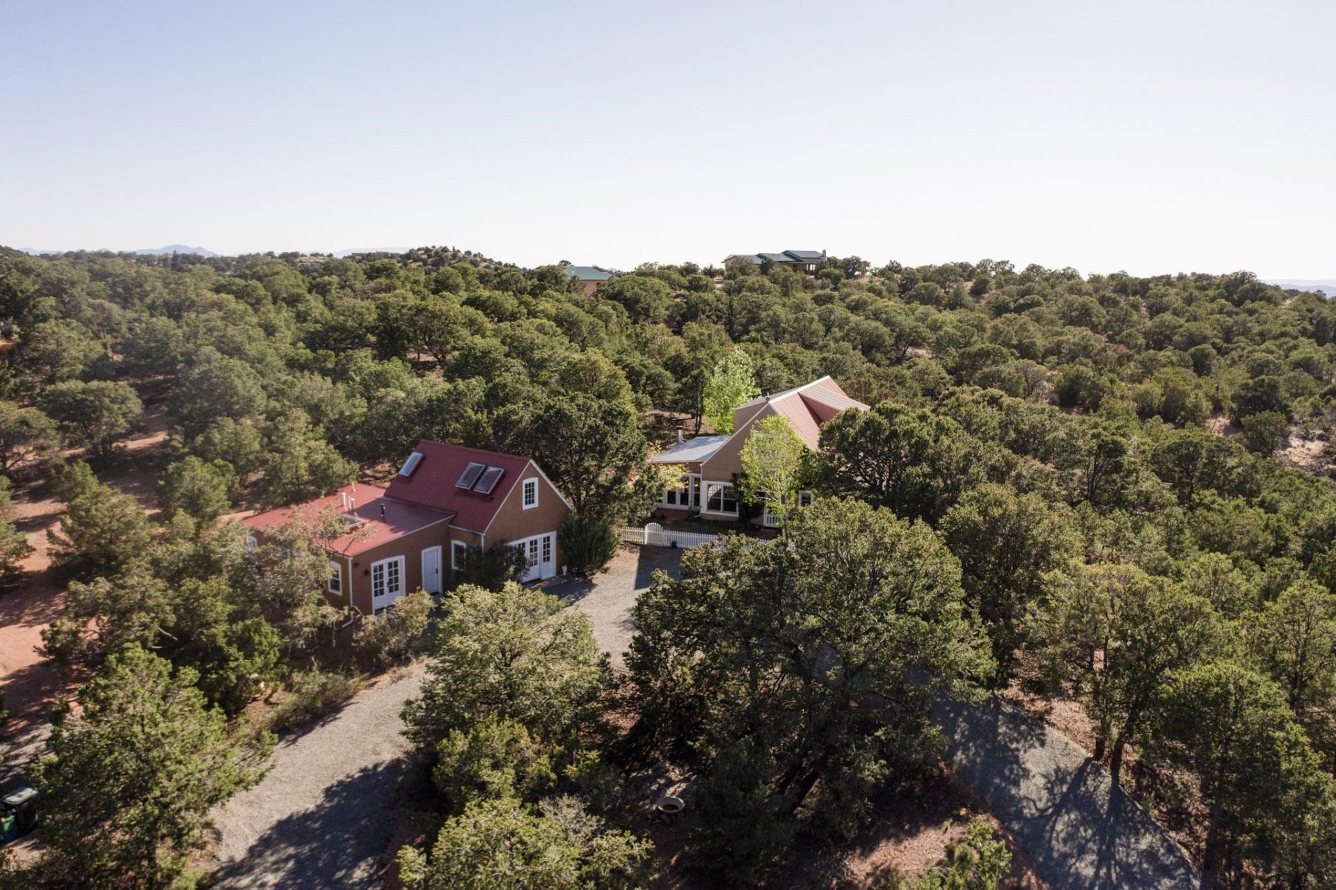 Romantic, Northern New Mexico style country compound nestled among the trees on the eastern flank of the Hondo Hills, on 7.4 acres only a few minutes drive to 3 sports clubs (including golf at Quail Run) and Santa Fe itself. With a nod to Betty Stewart, this pretty home, built by a structural engineer in 1987, has been extensively remodeled and expanded by the current architect owner to create this charming, peaceful haven. The main house construction uses Structural Insulated Panels (SIPs) making for a well insulated home, warm in winter and cool in summer. The first floor, with ample natural light from French doors and the many windows, flows serenely between the open plan kitchen/living/dining, a sunny office nook, a TV den and down the hallway to the chic primary suite with outside access to a shady brick patio. Upstairs beneath the tall pitched ceilings is a large office/occasional 3rd bedroom on one side and a large guest suite the other with a light filled sitting area between. A 10 ft wide portal spans the length of the house for outdoor enjoyment of the natural pinon woodland and views to the Jemez mountains to the NW, and north and east to the nearby foothills and rocky hilltops above the Old Santa Fe Trail. The nearby full guest house off the circular driveway, created in 2021, is a little gem entered through French doors to a delightful and cozy living room with a separate gourmet kitchen, a sunny dining room/studio (potential additional bedroom) and upstairs to the bedroom suite. This charming compound is completed by the new pitched roof studio hidden in the trees a short stroll from the main house. Gardeners will love the cottage garden in front of the main house and a fenced vegetable garden out back. Such a sweet home!