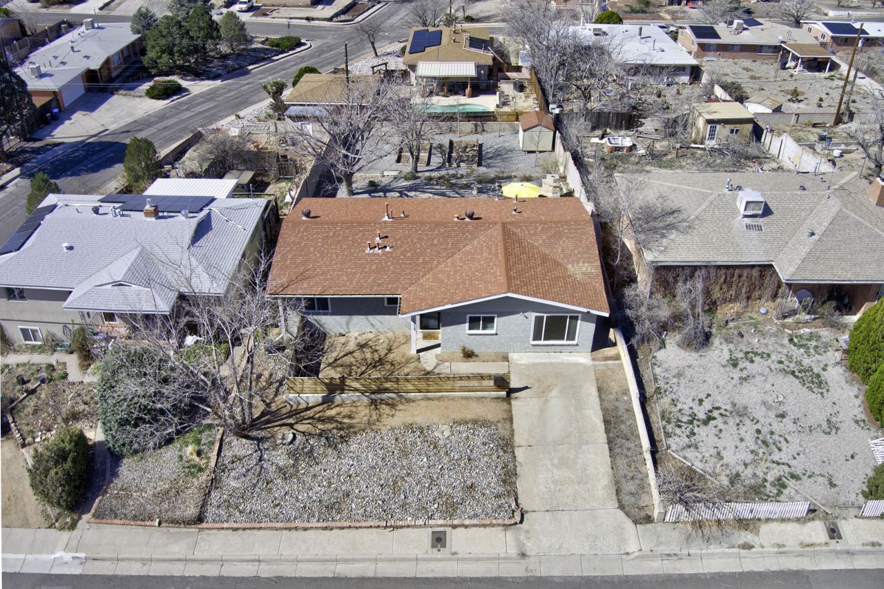 Light and bright, this beautifully reimagined classic home sits on a large elevated lot offering stunning sunsets and added privacy. Soaring vaulted ceilings and an open floor plan create an airy great room ideal for entertaining. The kitchen and baths were updated approx 2021, along with newer windows and refrigerated A/C.Since 2022, the backyard has been extensively upgraded with landscaping, hardscape, irrigation, water features with dedicated electrical, a concrete pad, and an expanded perimeter wall for added privacy (approx. $30K invested). Major improvements include a new PVC main sewer line, updated crawl space plumbing, and a replaced HVAC blower motor. New stairs were added to the floating deck in 2025.Located less than two miles from Nob Hill, the University of New Mexico,