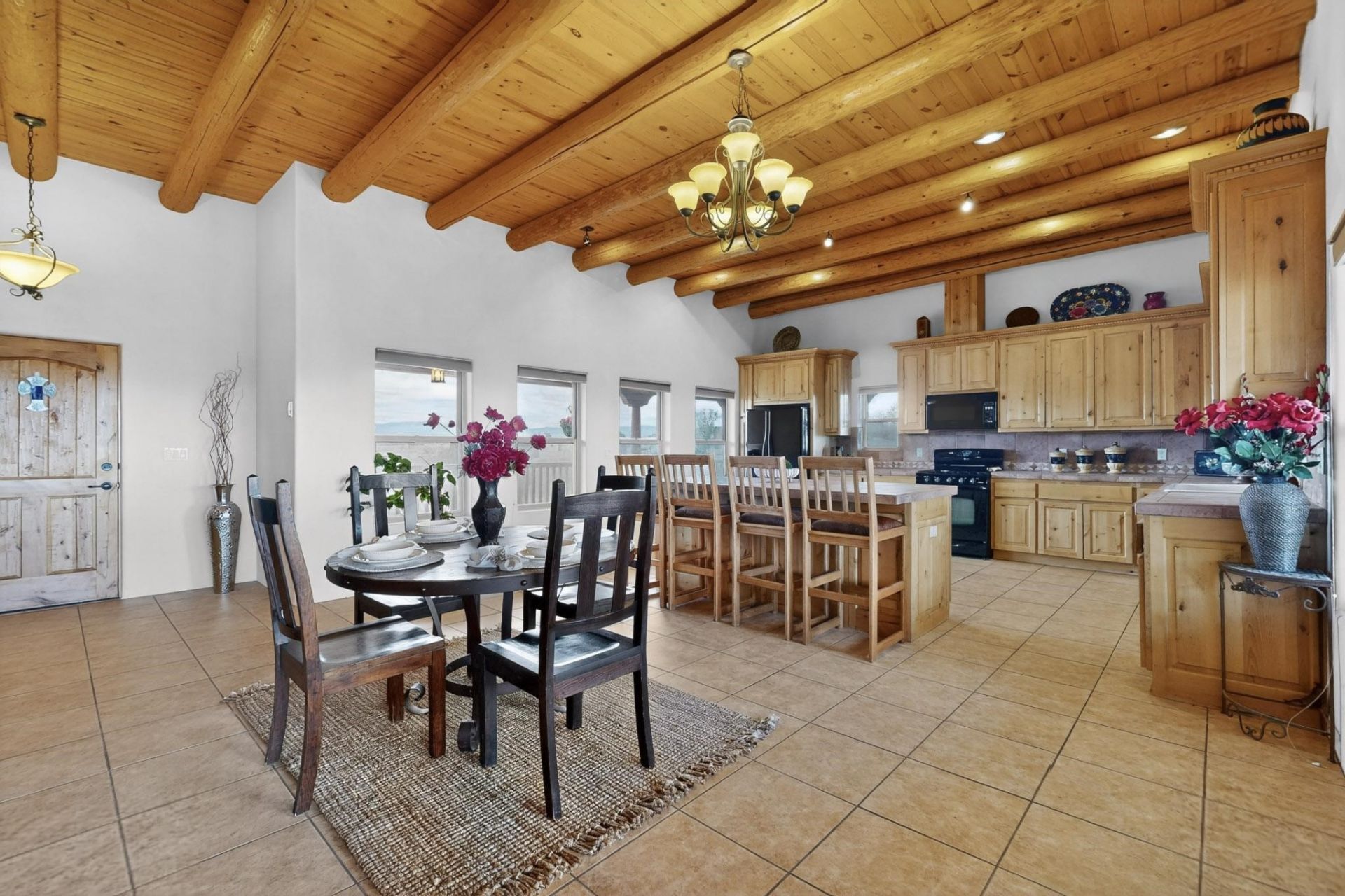 Nestled within the highly sought after gated community of Las Lagunitas with spacious lot sizes, this exceptional three bedroom two bath custom home on 1.36 acres embodies the perfect blend of refined Santa Fe comfort and elegance. Thoughtfully designed with a oversized two car garage and open concept layout, the spacious kitchen flows seamlessly into the dining and living room area and is ideal for both entertaining and everyday comfort. This single level residence features three oversized bedrooms and two bathrooms the Primary bedroom has a large jetted tub large walk in closet and a snail shower served up with instant hot water. This home features a stunning wraparound porch that captures the most picturesque elevated clear scenic views from all sides, both sunrise and sunset views are spectacular. Inside you will find a refined diamond plaster finish throughout the entire home, a water softener and large tile flooring that creates a clean and sophisticated look. The inviting living room features a charming kiva fireplace, tall ceilings and vigas that add warmth and authentic Santa Fe character to the space and has been well kept and loved by one family since being built! A large well maintained back yard with a beautifully built coyote fence made for privacy and ready for your entertainment. This home features a large crawlspace under the home that can be used for storage. Enjoy beautifully maintained common areas and landscaped grounds of Las Lagunitas, perfect for peaceful tranquil walks with your dog alongside serene ponds where fishing is also allowed offering a true connection to nature. Easy access to I-25