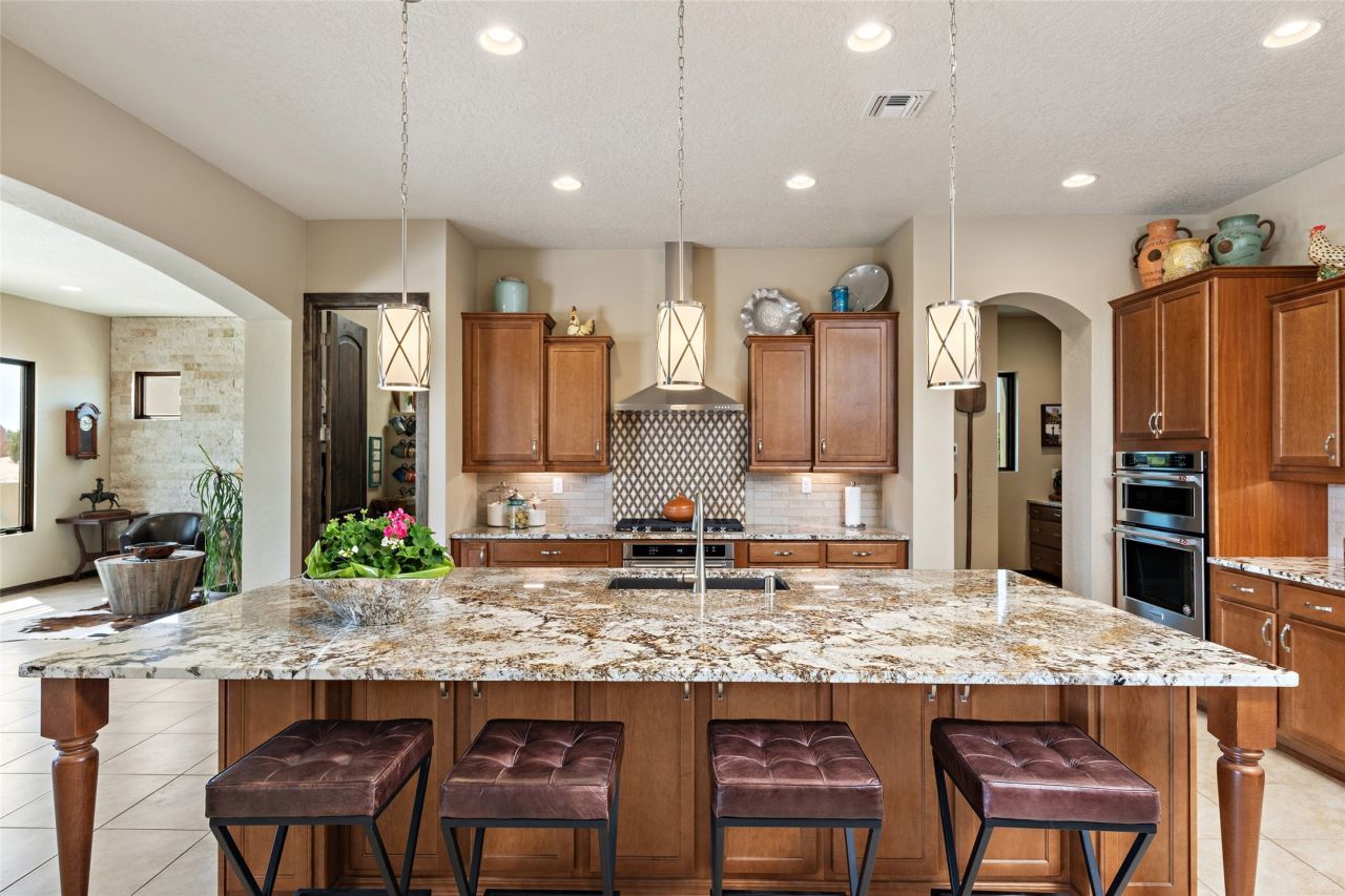 Imagine waking each morning to golden light painting the Sangre de Cristo mountains in shades of rose and amber, streaming through expansive east-facing windows. Nestled on a coveted corner lot in exclusive Las Campanas, this semi-custom property captures your heart from the moment you step through the welcoming courtyard. Picture yourself hosting sunset gatherings on beautifully landscaped brick and stone terraces that flow effortlessly indoors. The living room's dramatic four-panel sliding doors glide open, while your guests gather around the deep portal's romantic kiva-inspired fireplace as you prepare culinary favorites at the integrated outdoor gas kitchen. The gourmet kitchen is spectacular?top-tier appliances, a commanding 12??6-foot granite island, wine cooler, and walk-in pantry. The primary suite is pure tranquility with stunning mountain views, spa-inspired soaking tub, oversized walk-in shower, and dual closets. With five bedrooms and five baths, there's room for everything you love. Three of those bedrooms surround a spacious hub perfect for your home gym, meditation studio, or playroom, while the detached casita offers welcome privacy as a spacious office or en-suite guest quarters. Share tranquil mornings in the sunroom or cozy evenings in the living room by the six foot natural gas linear fireplace. This home shines with smart-home functionality, soaring arches, elegant tray ceilings, and authentic stone walls. Three lush green belts embrace the property, framing distant views of both the Sangre de Cristo and Jemez ranges. Watch spectacular sunrises and sunsets surrounded by three dozen evergreens and abundant birdlife in this Audubon Sanctuary neighborhood. Minutes from The Club at Las Campanas, enjoy world-class golf and resort amenities. Memberships are available for purchase and upon approval. The seller offers curated furnishings as a separate bill-of-sale for an effortless, move-in-ready experience.