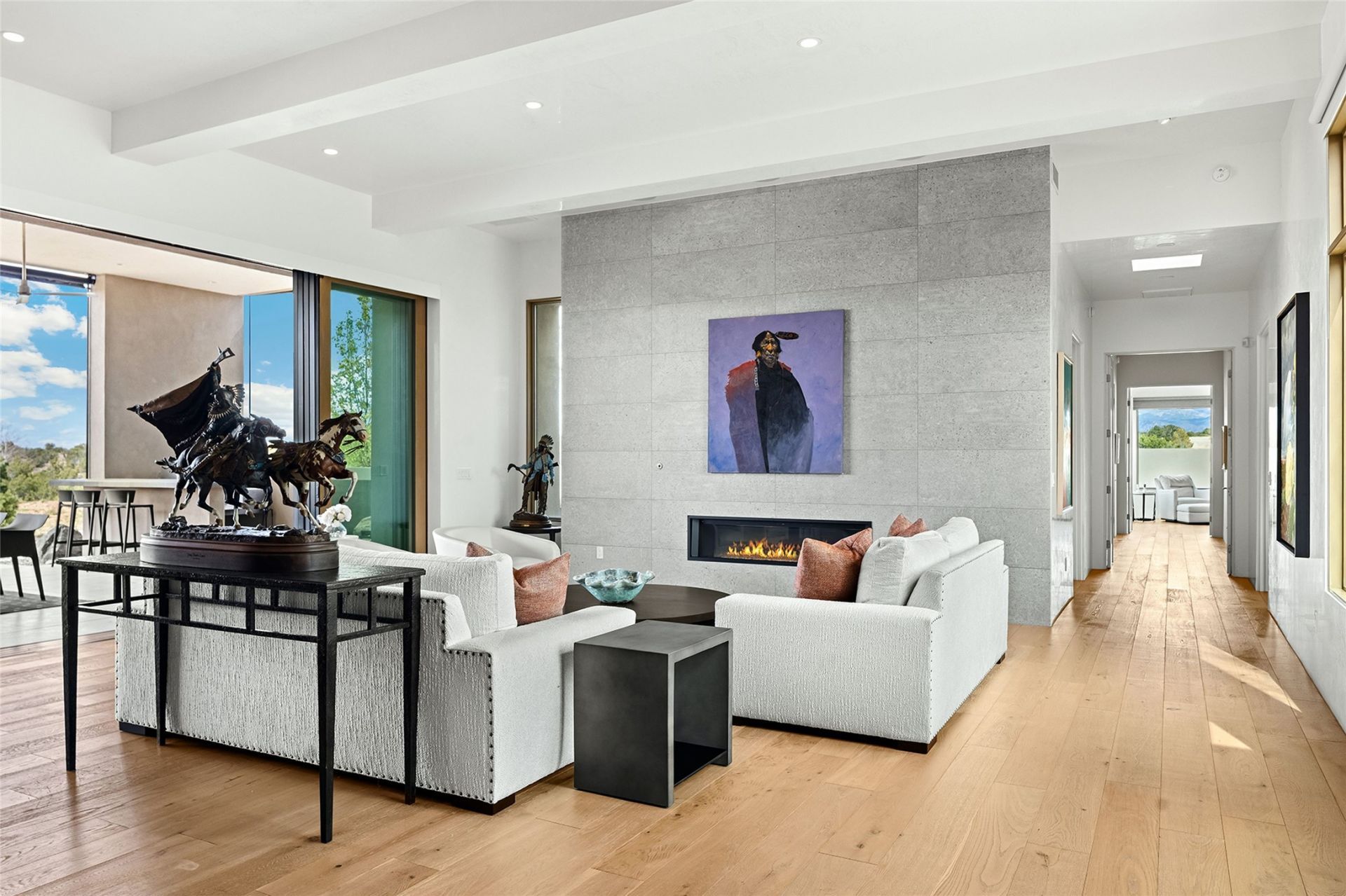 This Las Campanas masterpiece by award-winning builder Frank Yardman defines high-desert luxury. A true architectural tour de force, this sophisticated residence captures sweeping Sangre de Cristo and Jemez Mountain views, blending modern elegance with the quintessential Santa Fe lifestyle. The open-concept living and dining areas are designed for seamless entertaining, featuring retractable glass walls that perfectly frame mountain vistas and create the ultimate indoor-outdoor experience. The chef's kitchen is a culinary delight, equipped with state-of-the-art Thermador appliances, a massive breakfast bar, and a full butler's pantry?all of which opens to the primary dining and entertainment spaces. The spacious, private owner's suite impresses with panoramic mountain views and a spa-inspired bath featuring a glass shower, freestanding soaking tub, dual vanities, a vanity closet, and two large walk-in closets. Located in separate wings of the home, two additional ensuite bedrooms offer comfort and privacy for guests. Versatility abounds with a generous office featuring built-in cabinetry, an exercise room (or secondary office), and a cozy media den located directly off the kitchen. The incredible outdoor living experience was designed by renowned landscape architect Solange Serquis. Recent updates include a modern concrete driveway and a custom metal entrance gate that sets a tone of sophistication. The outdoor living areas have been further expanded with courtyard walls, premium hardscaping, and a kiva fireplace situated perfectly off the outdoor kitchen. Located just minutes from the world-class amenities of The Club at Las Campanas, this exceptional residence is move-in ready. Most furnishings and the owner's Equity Golf Membership are also available for purchase on a separate bill of sale.