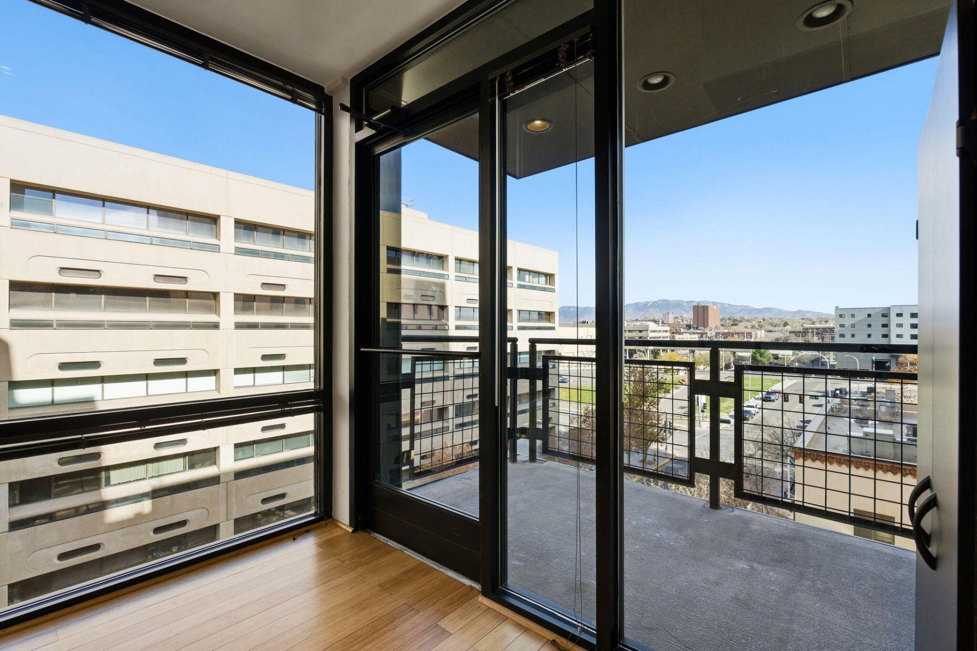 Full-floor commercial condo in the heart of Downtown Albuquerque with flexible mixed-use zoning. Located in the Acropolis Condominiums, this 1,146 sq ft space offers exceptional versatility under MX-FB-UD zoning, allowing for office, studio, creative workspace, retail, professional services, or Live/Work use (buyer to verify permitted uses).The suite features direct elevator access, secure key-fob entry, and a dedicated parking space in the adjacent city-owned garage for convenient client and employee access. The layout includes two private rooms plus a flex space ideal for offices, conference, reception, or collaborative work areas.Floor-to-ceiling windows provide abundant natural light and showcase Downtown and mountain views, with two private balconies offering additional worksp