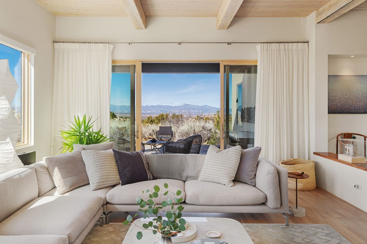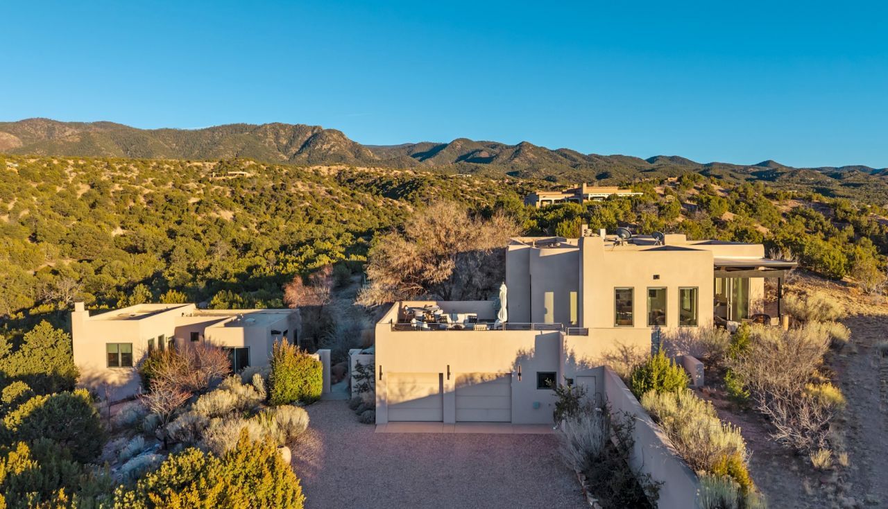 This refined main house and private casita is set high in the rolling Tesuque foothills of the Sangre de Cristo Mountains. Extensively re-designed and guided by Feng Shui principles so that energy moves smoothly, the main house creates an immediate sense of calm and well-being, with cherry wood floors, rich surfaces and fine details. A quiet retreat with serene spaces sets you inside the landscape of atmospheric views that stay with you. Three patios offer a choice of light and space throughout the day. Effortless indoor?outdoor living can be enjoyed from sunrise to sunset--this home welcomes both quiet reflection and great hosting.The kitchen cabinetry and other custom pieces were milled and hand made from a single walnut tree from Oregon by a local artisan.The great room and den offer warmth and light, with curated views, and each open directly onto its own outdoor space. The calming primary bedroom flows into a restorative, spa-like experience: From soaking tub to sauna to shower, then stepping outdoors to the hot tub for star gazing? an outdoor shower completes the experience. Next, the charming 2-bedroom, 2-bath guest house, which is separated by gorgeous native plantings and fruit trees, has its own entrance and parking to provide exceptional privacy and flexibility for guests. This home offers a rare balance of seclusion and access?equally suited as a lock-and-leave retreat or a primary residence. Serene and immersed in nature, yet minutes from The Four Seasons, Tesuque Village Market, El Nido, and app. 15 minutes to the Plaza and the Santa Fe Opera. Gated Los Caminitos comprises 573-acres with mapped trails for residents, a clubhouse, pool, tennis and pickleball.