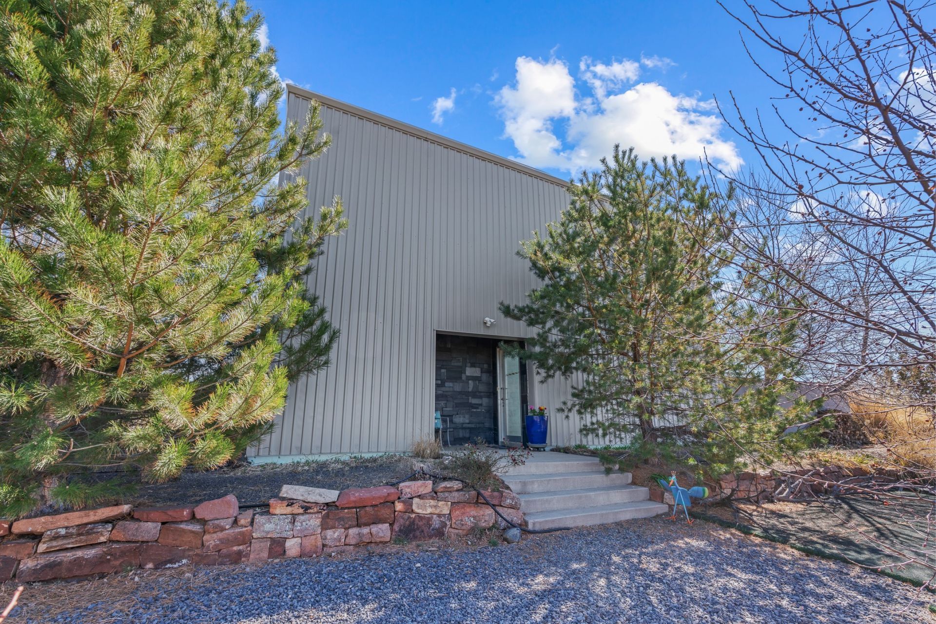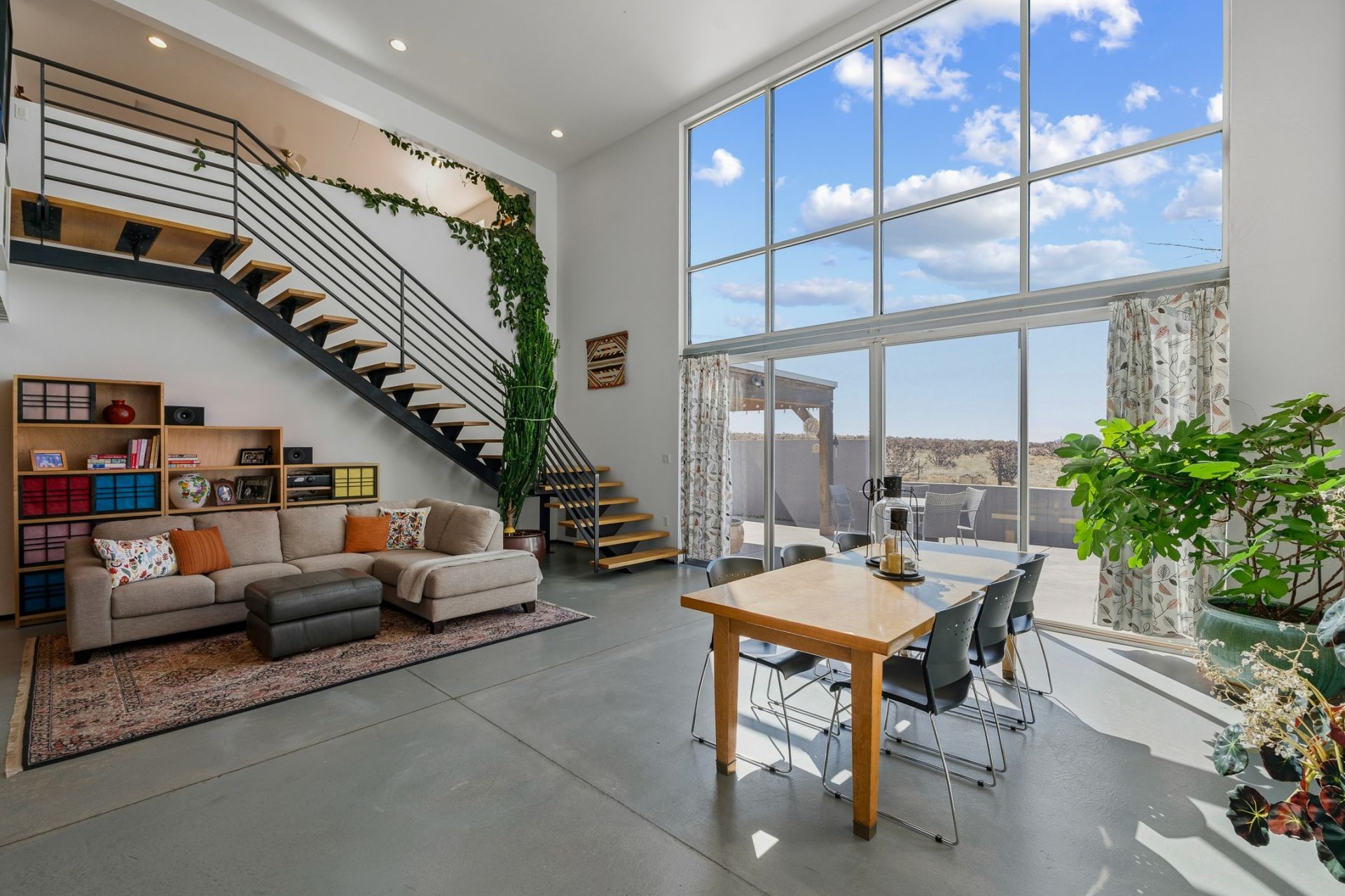 Sculptor-designed Modern Compound with Guesthouse, Shop with Unobstructed Views bordering BLM Land. Built in 2007 with exceptional craftsmanship, this custom steel-and-concrete home offers a rare blend of modern design, energy efficiency, & privacy on the edge of undevelopable BLM land. Commercial- grade windows & doors, 12 insulated walls (R-50), radiant in-floor heat, & mini-splits provide year-round comfort. Whole house catalytic carbon filtration for PFAS & contaminants. The main house features soaring 18?19.5' ceilings, concrete floors, passive solar living/dining spaces with dramatic 16' windows, & unobstructed views of the Ortiz Mountains, Cerrillos Hills, & Sandias. A chef's kitchen anchors the home with stainless counters & island, cherry cabinetry, Viking range, Bosch dishwasher, double ovens, & a walk-in pantry. Quiet spaces include a library-style study/bedroom with built-ins on the main level, upstairs loft bedroom and TV/study areas, spa-like bath with slate and glass shower, and abundant storage. Sound-proofed construction separates the main house from the guesthouse for true privacy. The fully equipped guesthouse offers flexible living with radiant heat & mini splits, a full kitchen, steam shower, jetted tub, one bedroom plus a study, & dramatic operable glass garage doors which open to private patios?ideal for guests, rental income, or multigenerational living. A 3,100 sq ft insulated red iron steel shop (2014) with high-psi concrete floors for heavy equipment, pellet stove, plumbing (1/2 bath), including 1,100 sq ft loft, and 3-phase power is perfect for artists, or serious tradespeople. Outside, enjoy a fully fenced, irrigated landscape. A gardener's dream! with over 80 native & fruit trees, an edible forest garden with serviceberries, buffaloberry, elderberry, gooseberry, red and yellow currants, raspberries, native plum & cherry. The setting is expansive, & visually stunning, with seasonal cactus blooms across the protected BLM land with easy access to trails and the Santa Fe River.