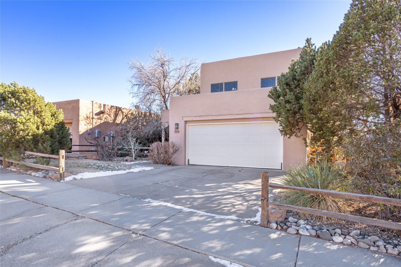 Welcome home! This light and bright 3 bedroom 3 batrhoom, two-story home in the quiet neighborhood of Pueblos del Sol, offers convenience, southwest character with vigas and a kiva fireplace as well as thoughtful updates throughout. Enjoy the classic Saltillo tile flooring on the main level and a mature, fully fenced, tree-filled backyard that provides both shade and charm to enjoy while sitting on the finished back deck! Upstairs, you'll find three sunny bedrooms with newer carpet, including a spacious primary suite featuring a generous walk-in closet and a bathroom illuminated by skylights that welcome in beautiful New Mexico sunshine. And don't forget the heated 2 car garage for conveneince! Easy to see, schedule a showing today! Ideally located, this home offers quick access to coffee shops, restaurants, medical facilities, and an easy commute to I-25, 599, and Hwy 285/84. Schedule a showing today, don't miss this one!