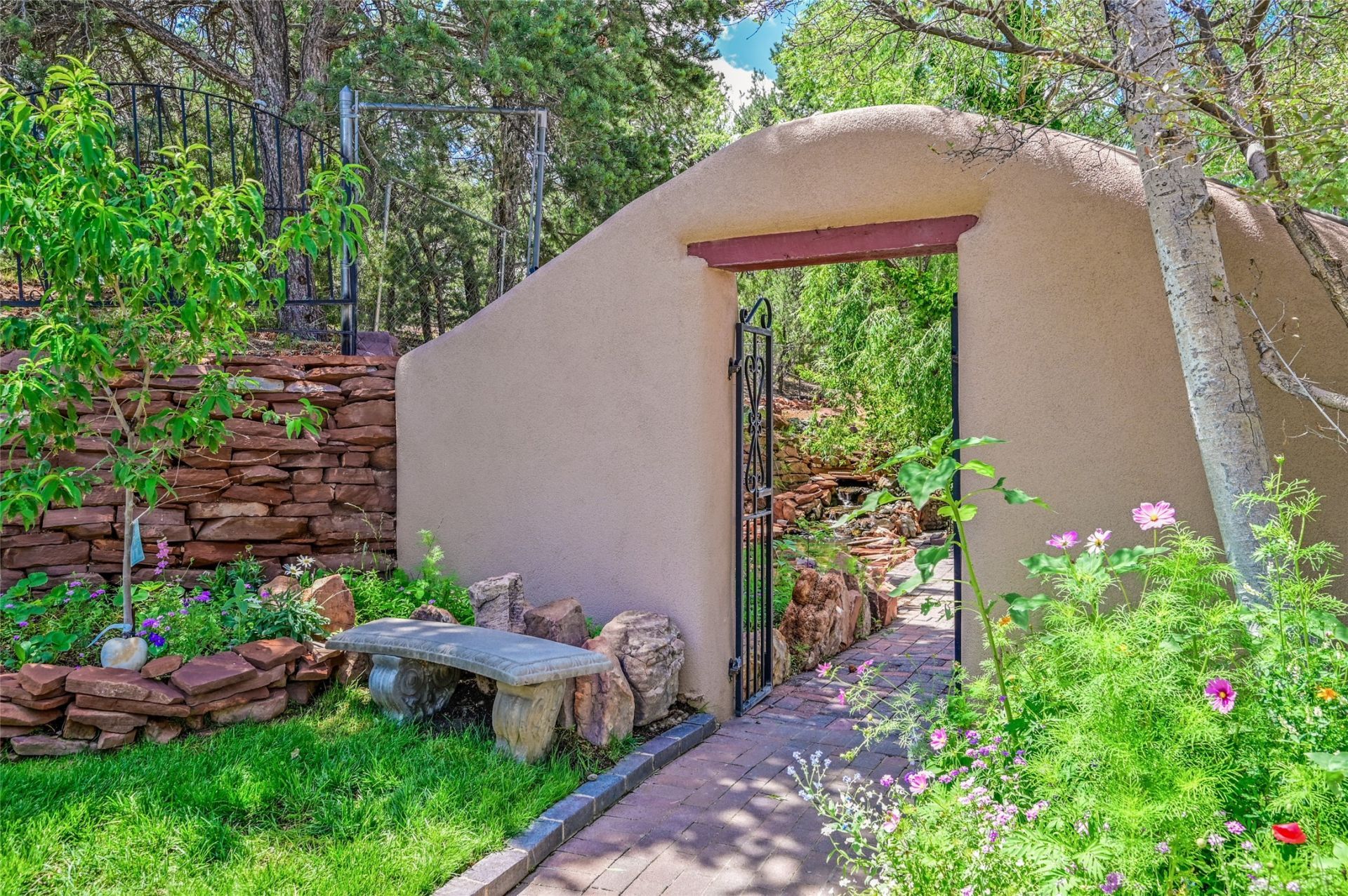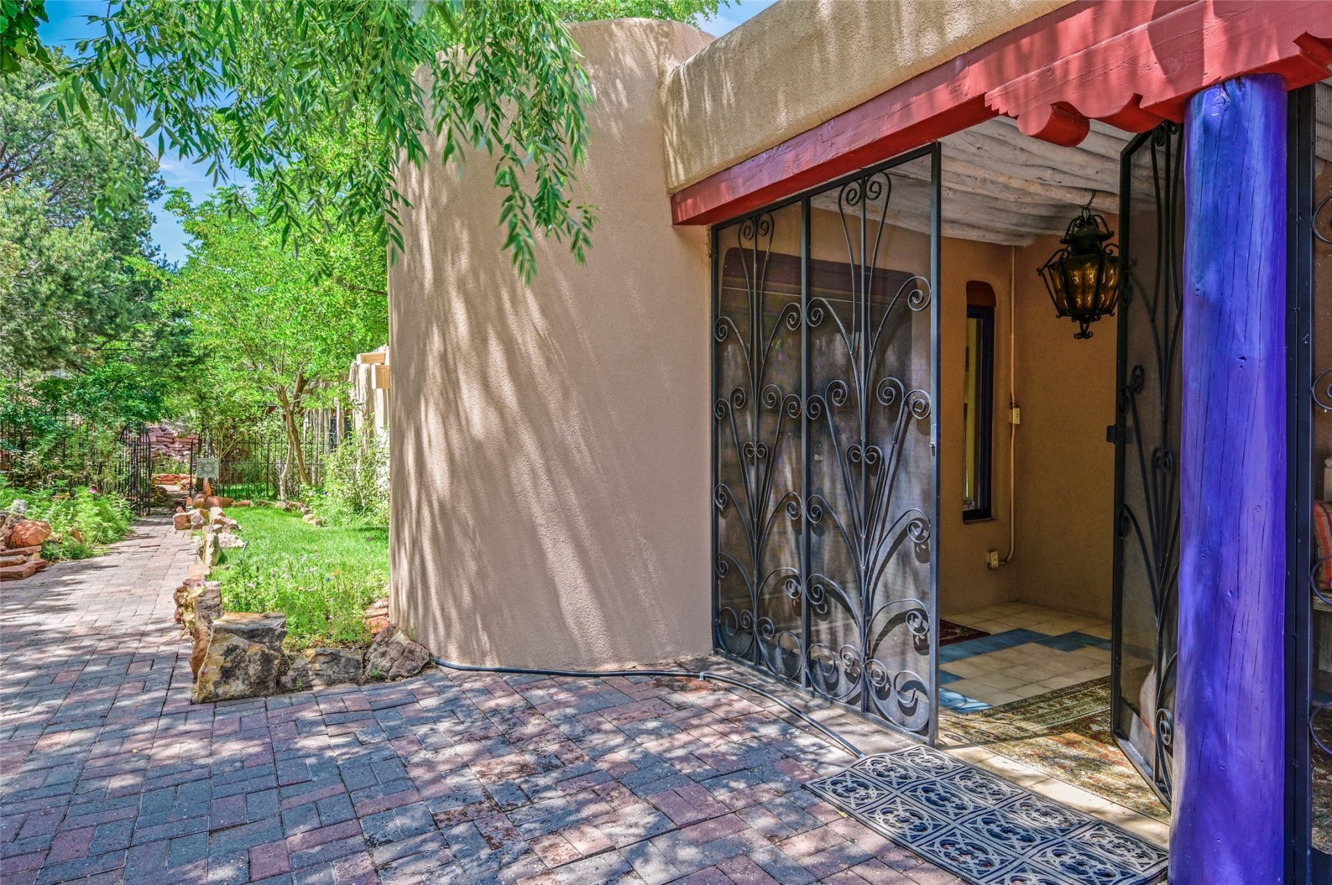 Your traditional Santa Fe Casa awaits! Nestled just minutes off of the historic Old Santa Fe Trail and only 15 minutes from the heart of downtown Santa Fe, this adobe estate captures the essence of classic Southwestern elegance and modern comfort. Set on 5-acres, the property offers total privacy and breathtaking panoramic vistas of the Jemez Mountains and Santa Fe city lights. The main residence features a grand living and entertaining space adorned with multiple cozy kiva fireplaces, high viga accented ceilings, brick floors, iron work, colorful floral wall motifs, and traditional craftsmanship. Many recent practical improvements to the roof, exterior, and systems have also been made. Four spacious bedrooms make this a comfortable retreat for full-time living or hosting of guests. Not to be missed is the spacious, upstairs artist's retreat with panoramic views - the perfect place to paint, work, write, and create! The primary suite is private and appointed with a large ensuite bathroom, access to the enclosed in-ground spa, patio access, and sweeping sightlines across the high desert landscape. The grounds are equally serene with water features and fountains, multiple garden beds, and private patio enclaves. A long western-facing, covered portal, spanning the length of the main living room is the perfect outdoor extension to the main home's grand indoor living. A detached 1BD-1BA guest house, with its own garage, offers privacy and comfort for visitors, family or invites the potential for rental generating income. Whether you're soaking in the golden hour light from one of the many outdoor living spaces or relaxing by one of the property's four fireplaces, this one-of-a-kind property offers an unparalleled canvas equipped with undeniable tranquility, vistas and convenience to Santa Fe's exquisite destinations.