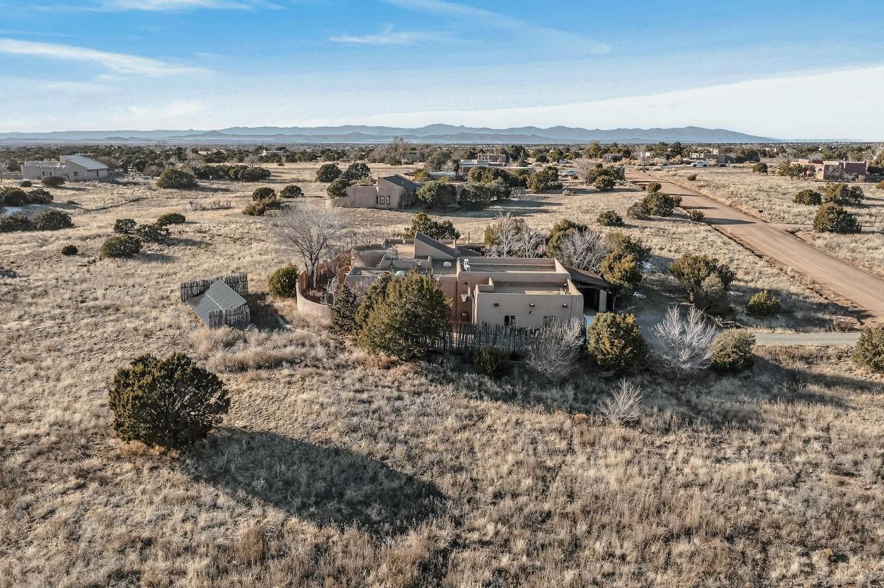 Priced to Sell! Custom designed and built for the first owner, this 4 bedroom 3 bath home is filled with eye catching hand carved details throughout. An excellent potential for multi family living with great separation of main bedroom and 2 guest wings. A sunny open plan concept with many extra rooms to expand your hobbies or private enjoyment areas. There is a new solar array, boiler, hot water heater and new above ground hot tub installed 2022/2023. New stucco, partial new roof and the 6 mini splits serviced in 2025. An oversized 2 car garage plus a studio bay with garage doors at both ends for easy access and plenty of guest parking. Two walled in private gardens for outside enjoyment accessed from north and south sides of the home. Ideally located bordering a large greenbelt, close to the community centre, hike bike trails, K-8 school, library, senior centre, 2 shopping plazas and only minutes into Santa Fe.
