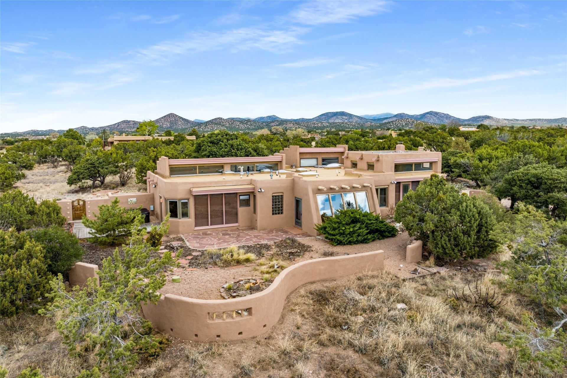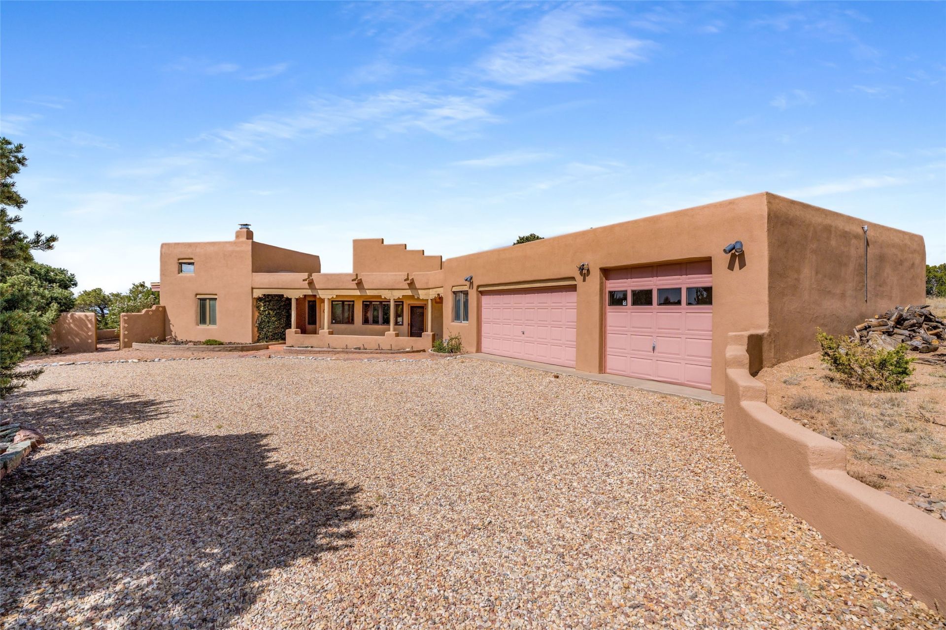 4 Montana Court is a distinctive Pueblo style residence, crafted in the mid 1980s by respected local builder John DiJanni as his personal home. Designed with passive solar Trombe Walls, and solar orientation, his charming home provides energy efficiency and the timeless warmth of classic Southwestern architecture. Set on more than two acres and bordering a greenbelt, the property enjoys remarkable privacy, separation from neighboring homes, and pleasing mountain views. A circular driveway creates an inviting and practical approach to the home. Inside, the formal living room centers around a traditional Kiva fireplace. A separate and generous office or media room?complete with vaulted ceilings, Vigas, clerestory windows, and its own exterior entrance?provides a flexible space ideal for work, creative pursuits, and a variety of uses. Adjoining the delightful and centrally placed kitchen, there is a dedicated Sunroom for growing herbs and plants throughout the year. The bedroom wing is finished with chipped edge travertine flooring, adding a refined touch. The generously sized primary suite includes a jacuzzi tub/shower, a single hardwood vanity, and a bidet. Two guest bedrooms feature vaulted Viga ceilings, clerestory windows, and abundant natural light, with a well placed full bath conveniently serving both rooms. A detached three car garage, connected to the home by a covered portal, offers excellent versatility; one bay has previously been used as an office or studio, and can easily be converted back to garage space if preferred.