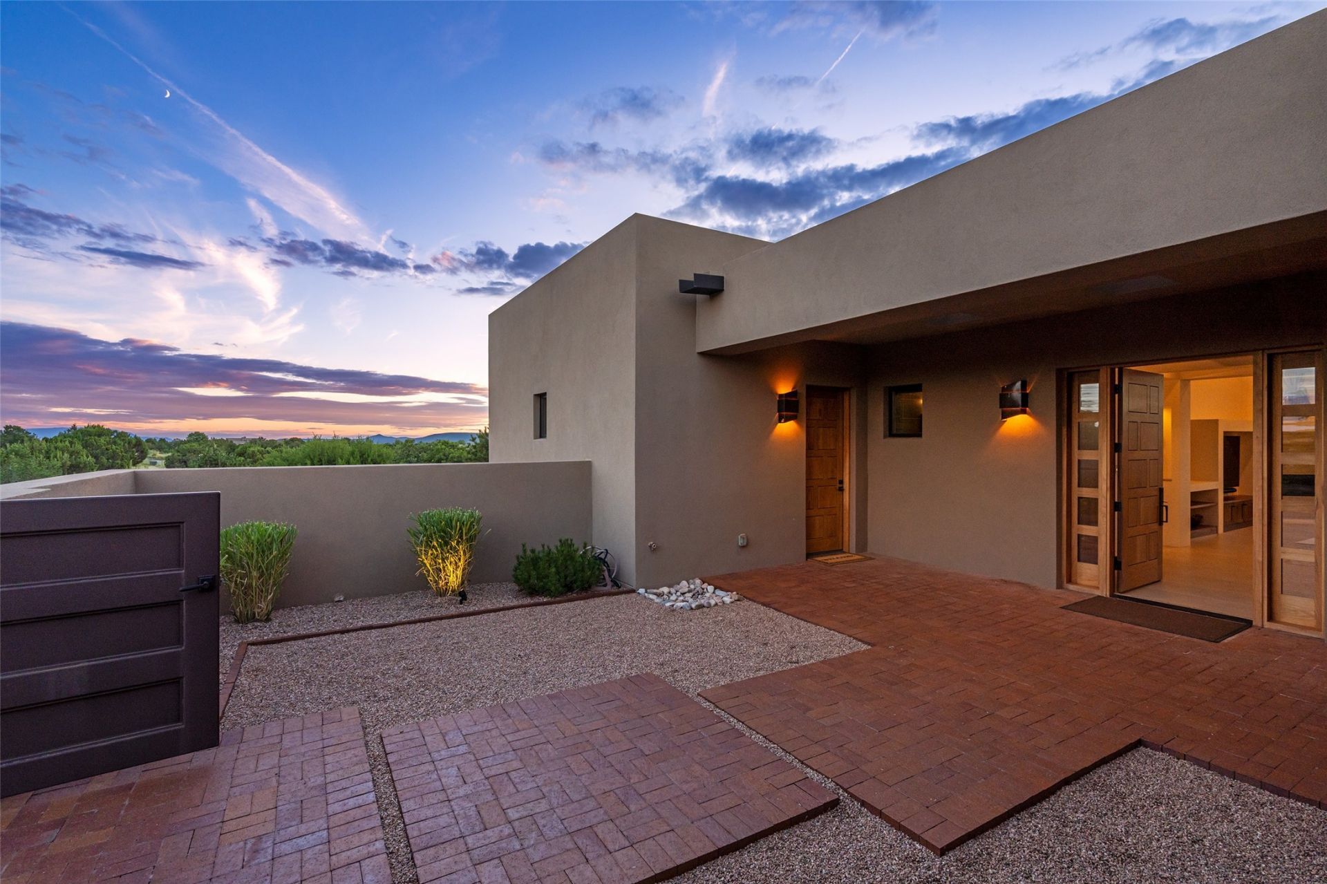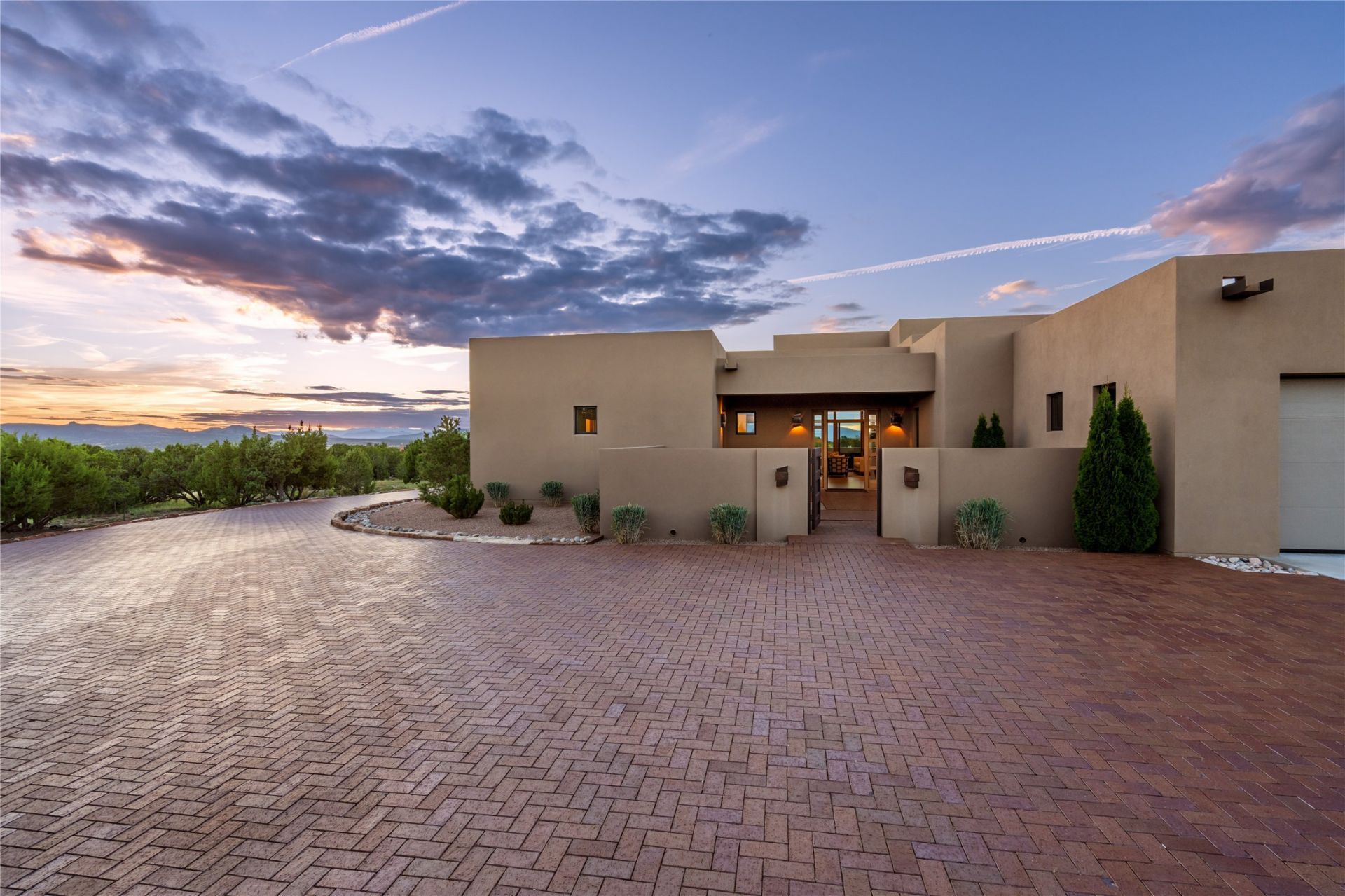 This nearly new soft contemporary home captures the essence of modern Southwest living. Set on 1.7 acres with unobstructed views of the Jemez, Sandia, and Sangre de Cristo mountains offering unforgettable sunsets and a seamless blend of indoor and outdoor spaces. Clean lines, soaring ceilings, three fireplaces, top of the line appointments, including Wolf dual ovens, and Sub-Zero refrigerator define the spacious open floor plan, making this the perfect dream home for the most discerning buyer. Built by award-winning builder Rick Driscoll, the residence offers an owner's retreat with fireplace, a second ensuite bedroom, and an expansive casita with its own entrance and mini kitchen. A fourth room for media/office provides added flexibility. All rooms have their own private portals offering sweeping views. The oversized three-car garage includes an attached climate-controlled artist studio, a separate workshop area with new built-in cabinetry and a separate storage area. Modern systems recently installed to enhance everyday living include a water softening system, dual reverse osmosis systems, humidification system, motorized/retractable Hunter Douglas blinds, and a Sonos audio-visual system throughout the home. Updated landscaping and a newly paved brick driveway complete the exterior to welcome you to the home. The sale includes the washer and dryer, two refrigerators, and a separate freezer, making this extraordinary home ready to enjoy from day one. Private, thoughtfully designed, and surrounded by panoramic mountain views, it is a rare find in Northern New Mexico. Beautiful!!!