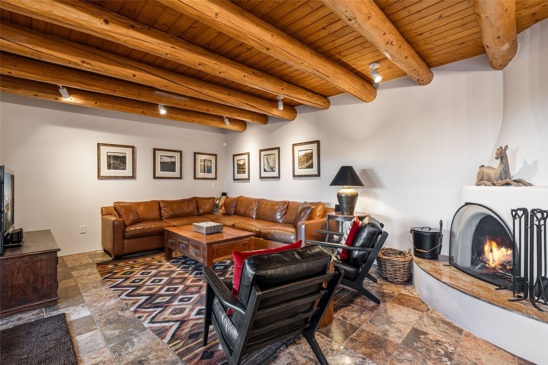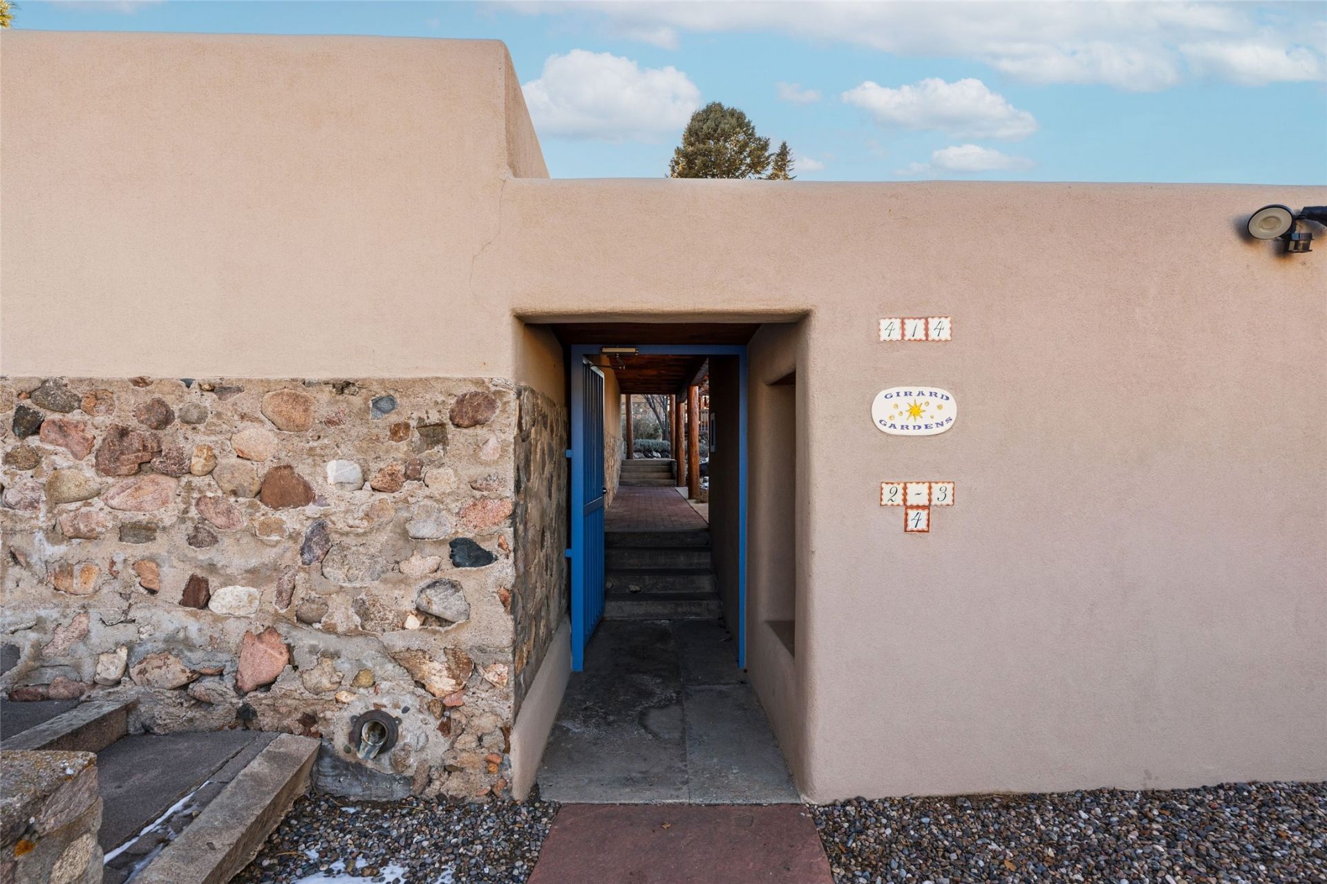 Historic Eastside 4-bedroom 3.5 bath home and attached casita in the gated Girard Gardens Compound located a block from the Canyon Road arts district of galleries, boutiques, and restaurants. The property was, at one time, owned by Santa Fe developer Alexander Girard, a famous textile designer and folk-art collector and echoes his vision. Within the gated compound, the private patio offers days of New Mexico sunshine and evenings full of pleasurable al fresco dining and entertaining. Â Mountain views from the expansive upstairs deck. Open concept living room and dining area share the warm and inviting kiva fireplace. Updated kitchen is appointed with stainless steel appliances and space for a bistro table for morning coffee or informal meals. Extra-large laundry room with plentiful storage. The 1,200+ sq. ft. casita with kitchen and separate deck offers possibilities as a studio, office space or as an income generating rental. A detached garage with EV charger is included with the main home. The guest casita has its own parking space. Newer (2020) forced heat and central air conditioning. Excellently located within close proximity to hiking, skiing, and numerous restaurants and cultural amenities.