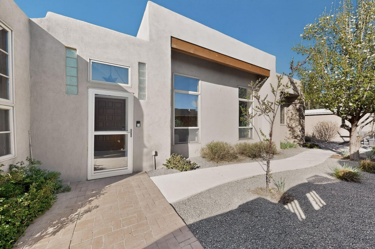 Tucked on a private lane off one of the North Valley's most charming streets, this gorgeous SW contemporary home offers a serene lifestyle near acequias & a lovely park. Over $100k in thoughtful upgrades elevate the home, include stunning travertine floors, beautiful, low-care landscaping & inviting patios. The flexible floorplan features 2 primary suites with large walk-in closets, while a large office with a kiva fireplace can serve as a cozy family room opening to the patio. High-end touches include Pella windows, TPO roof, new stove & smooth finish walls & high ceilings that complement the abundant natural light. Energy-efficient split units ensure year-round comfort. The oversized garage plus a backyard storage unit complete this exceptional property.