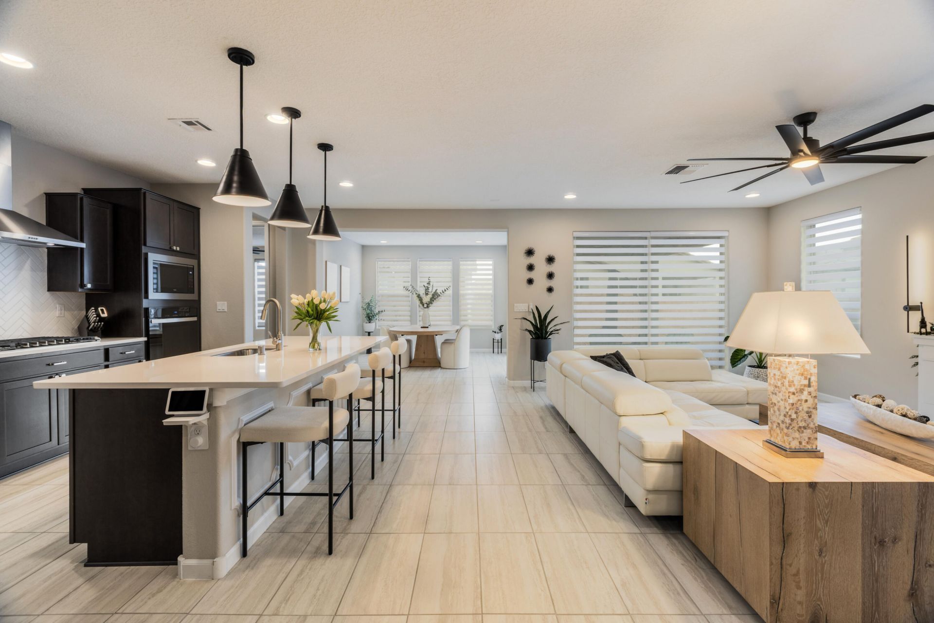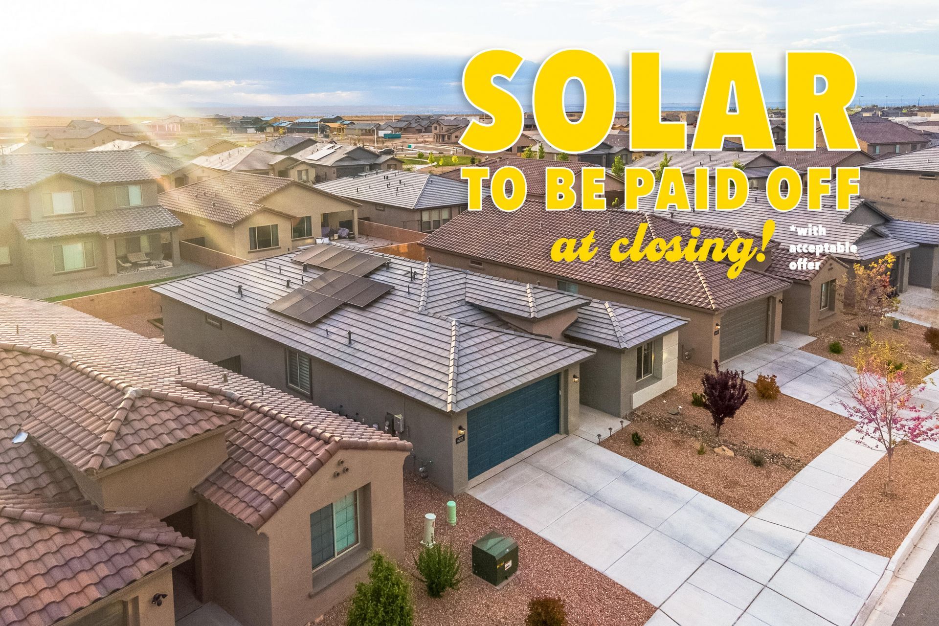 Incredible opportunity to own this bright, beautiful, like-new, move-in ready, energy-efficient single-story home in Mesa Del Sol. SOLAR TO BE PAID OFF AT CLOSING! Sophisticated and beautifully appointed, the chef-inspired kitchen features rich espresso cabinetry, quartz counters, stainless appliances including a gas cooktop w/ vent hood, herringbone tile backsplash - all illuminated by modern pendant lighting for a clean, upscale finish. Refrigerated air for optimal climate-control and comfort. The home flows effortlessly to outdoor space, covered patio - ideal for relaxation and entertaining. Fully landscaped w/ xeriscape and turf for a low-maintenance lifestyle. Minutes to Kirtland AFB, airport, UNM Hospital. HOA includes community POOL! Enjoy local events, parks, trails, large dog park