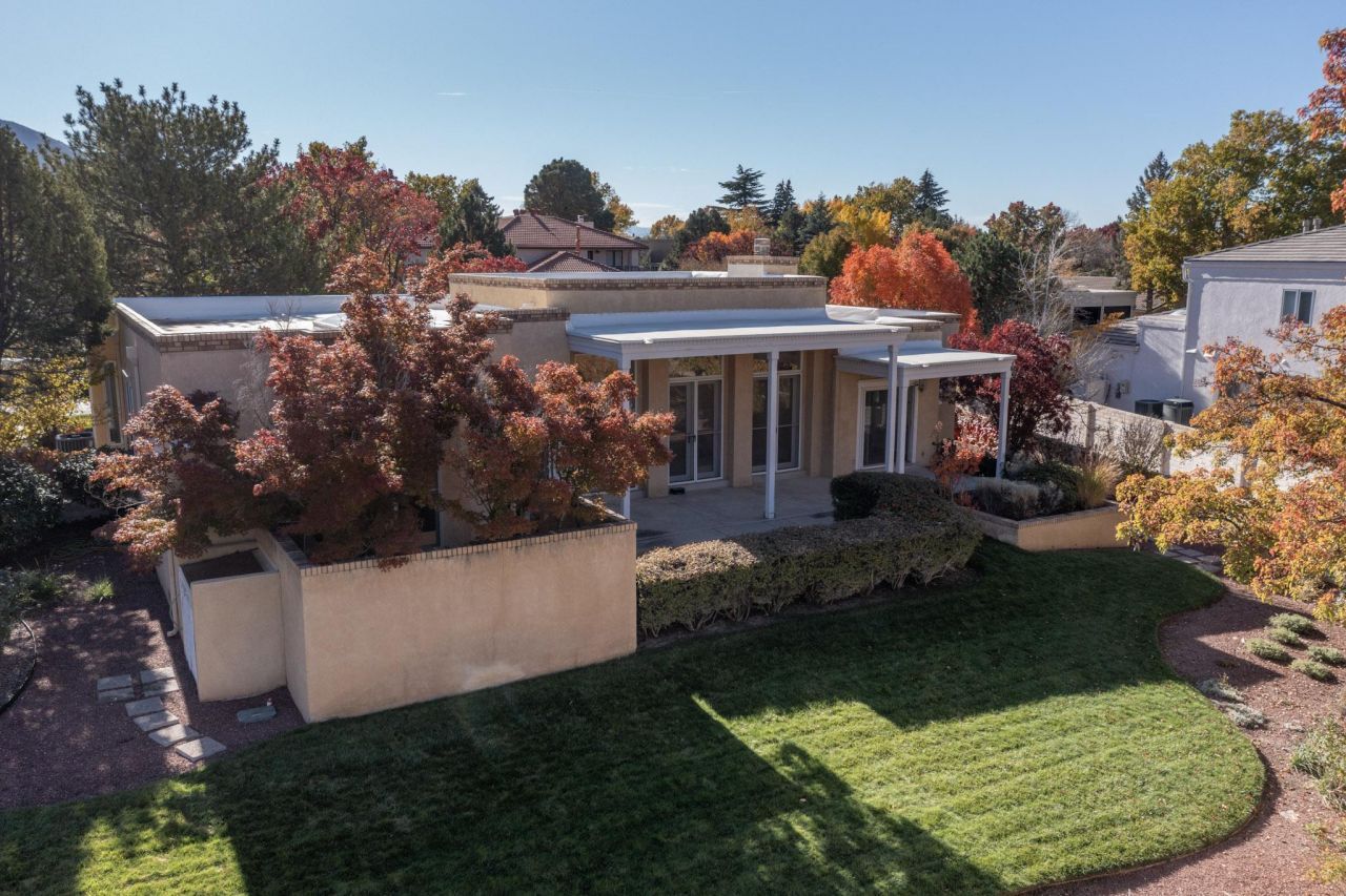 Prime corner lot in Tanoan, this single-level home offers refrigerated air, a TPO roof, and views of the clubhouse--all in one of Albuquerque's most sought-after gated communities. Enjoy the curb appeal of a beautifully landscaped yard and a functional floor plan featuring tall ceilings, three bedrooms plus a dedicated office, perfect for working from home or creating a flex space. Photos are virtually staged.
