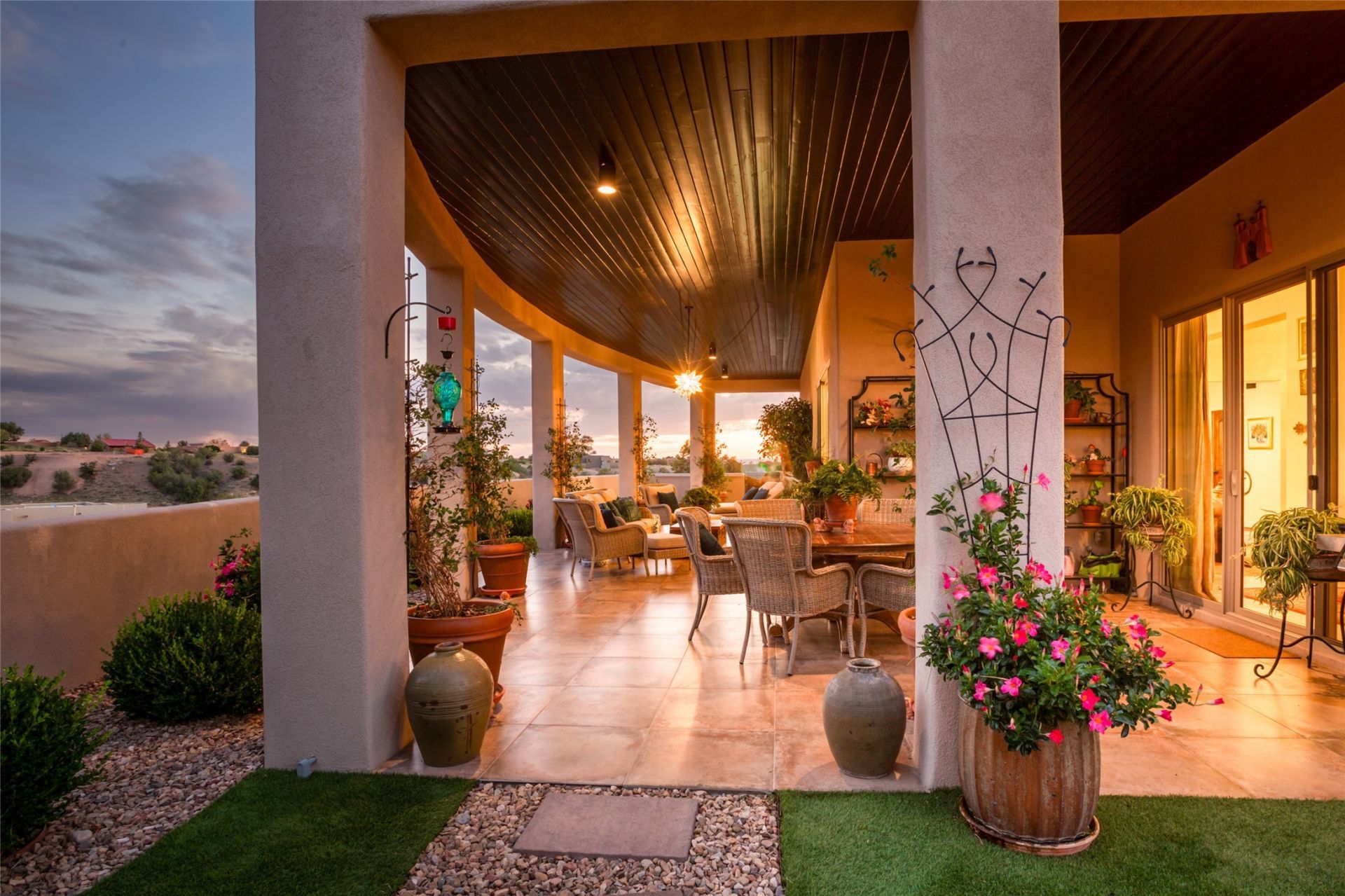 One-level Placitas home built in 2020, perfect for downsizing without sacrificing quality. The bright kitchen features high-end appliances, double ovens, a copper sink, a large pantry, and marble backsplashes. The great room and dining room overlook the Sandia Mountains and open onto an east-facing wraparound patio ideal for outdoor enjoyment. The large primary suite also has mountain views and a door to the covered patio; its spa-like bath includes double sinks, a luxurious tub, and a walk-in shower. Two additional bedrooms on the opposite side of the house share a full bath. Gorgeous outdoor spaces, easy-care landscaping, and an immaculate three-car finished garage with epoxy floors and storage complete this perfect Placitas perch.