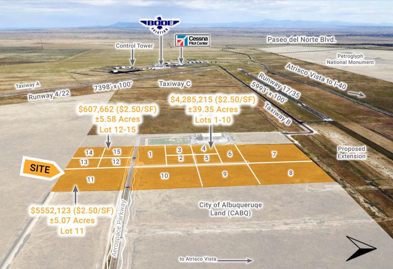 +/-50 acres for sale within an Opportunity Zone and Free Trade Zone. NR-SU zoning allows a wide range of uses, including airport-related industrial, warehouses, and manufacturing. Ideal for aviation, aerospace, and industrial operations. Utilities are available to the property line (verification required). Potential direct runway access with FAA and City of Albuquerque Aviation approval. Located at Double Eagle II Airport, an active general aviation facility averaging 65,000-75,000 aircraft operations annually with a contract-controlled tower. Positioned just north of I-40, near Amazon Distribution and other major industrial users.