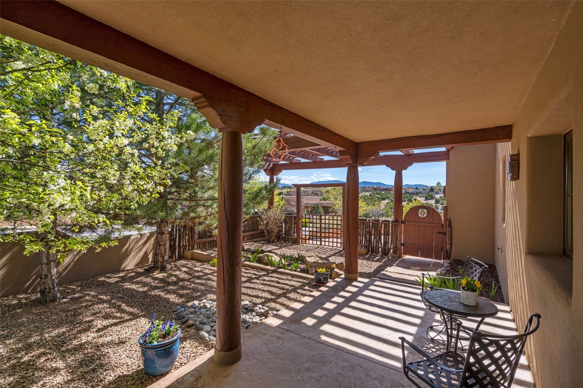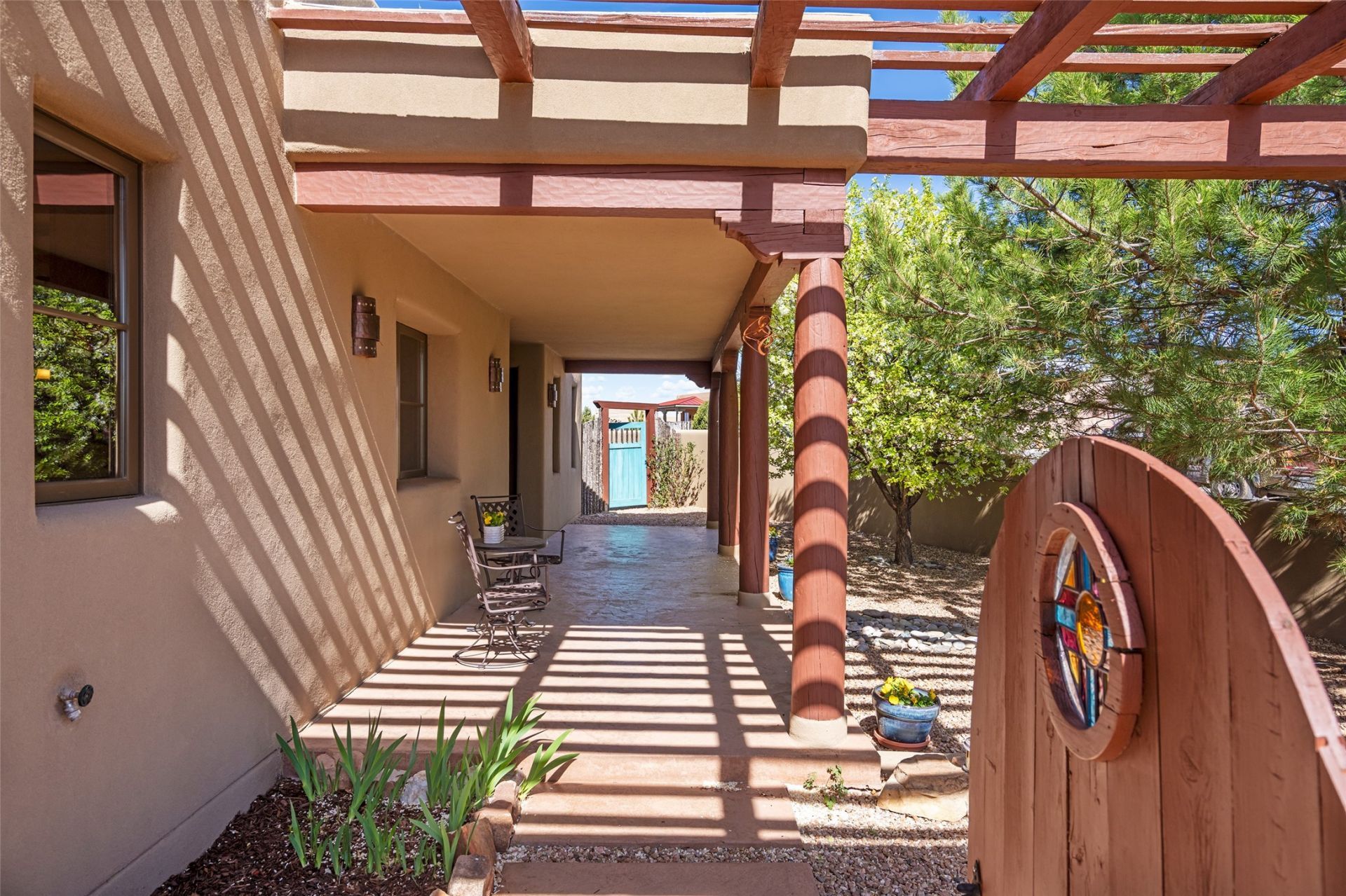 Run, don't walk to experience this outstanding new offering in the sought-after Aldea de Santa Fe. Beautifully crafted in classic Pueblo style, this home captures the essence of Santa Fe living with warmth, character, and thoughtful design throughout. A welcoming foyer opens to a spacious great room filled with natural light, where plaster walls, a beautifully crafted kiva fireplace, wood-beamed ceilings, and tile floors create an inviting and timeless aesthetic. The open kitchen is both functional and charming, featuring abundant storage, granite countertops, a stone tile backsplash, and delightful views from the kitchen sink. Designed with comfort and privacy in mind, the split-bedroom floor plan offers a generous primary suite with direct access to the rear patio. The luxurious bath includes a soaking tub, separate shower, dual vanities, and a well-sized walk-in closet. On the opposite side of the home, two additional bedrooms provide flexibility for guests or work-from-home needs, including one ensuite. Outdoor living is equally appealing, with a charming front courtyard?perfect for morning coffee?and a stone patio ideal for enjoying sunset skies and surrounding views. An oversized garage offers ample space for storage or a workshop. Recent upgrades ensure peace of mind and year-round comfort, including a brand-new roof with a transferable warranty and four newly installed mini-splits for efficient heating and cooling. This mostly single-level home (with just one step in the garage) offers ease of living in one of Santa Fe's most desirable communities.